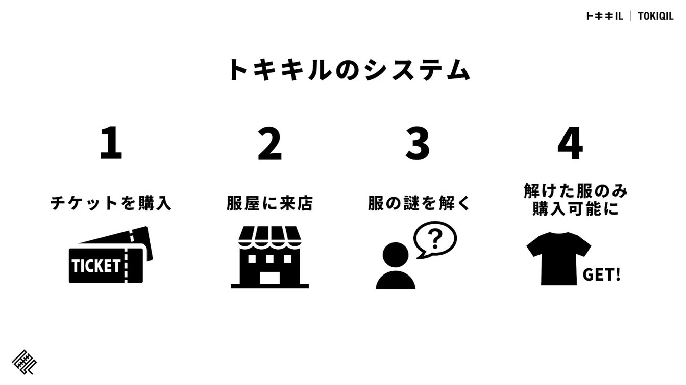 トキキルには実店舗は存在せず、定期的にポップアップストアが開催されている。ストアへの入店にはチケットが必要で、制限時間も設けられている。その時間内に、気になった洋服のデザインに隠された謎を解かなければ、購入ができないという仕組みだ。