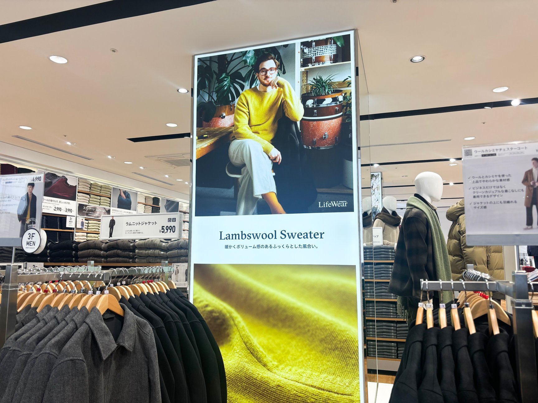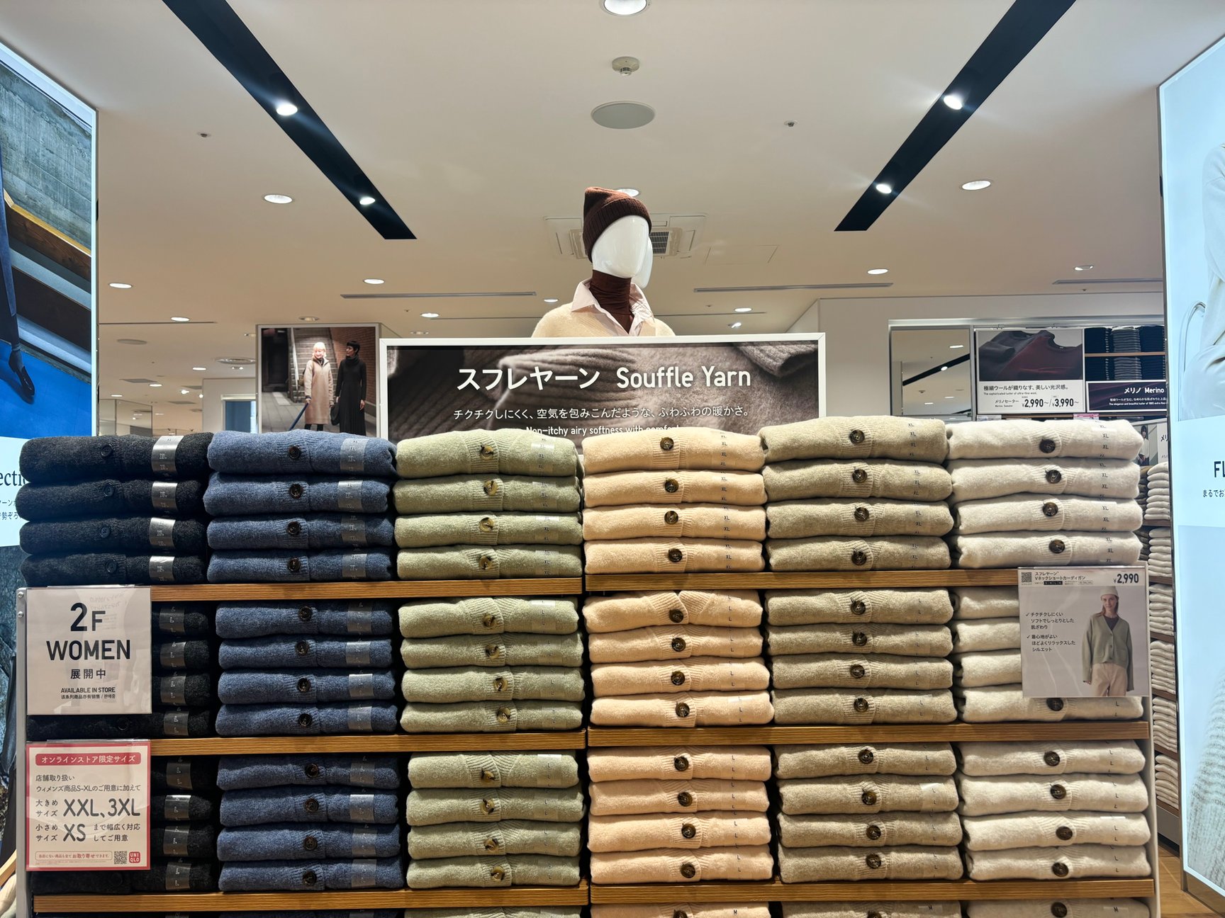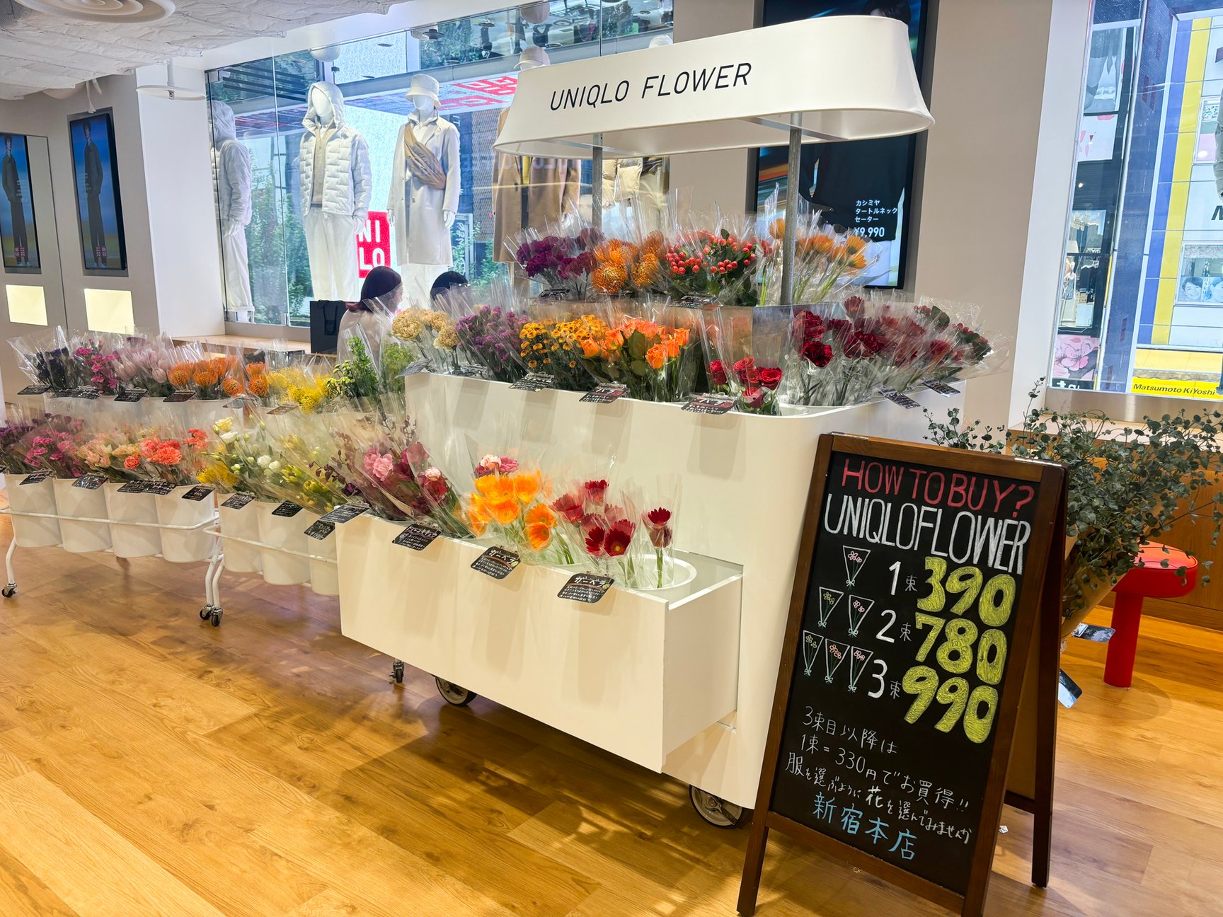 「ビッグカメラ 新宿東口店」と連結している1階は、メンズ、ウィメンズのニットアイテムを中心に展開。カシミヤ、スフレヤーン、メリノ、ラムウールなど、素材ごとに分けて売り場を構成する。営業開始時はニット類中心だが、春は羽織物、夏はエアリズムなど、気候とトレンドに応じて売り場を変えていくという。入り口付近では「ユニクロフラワー(UNIQLO FLOWER)」の生花販売も行う。
