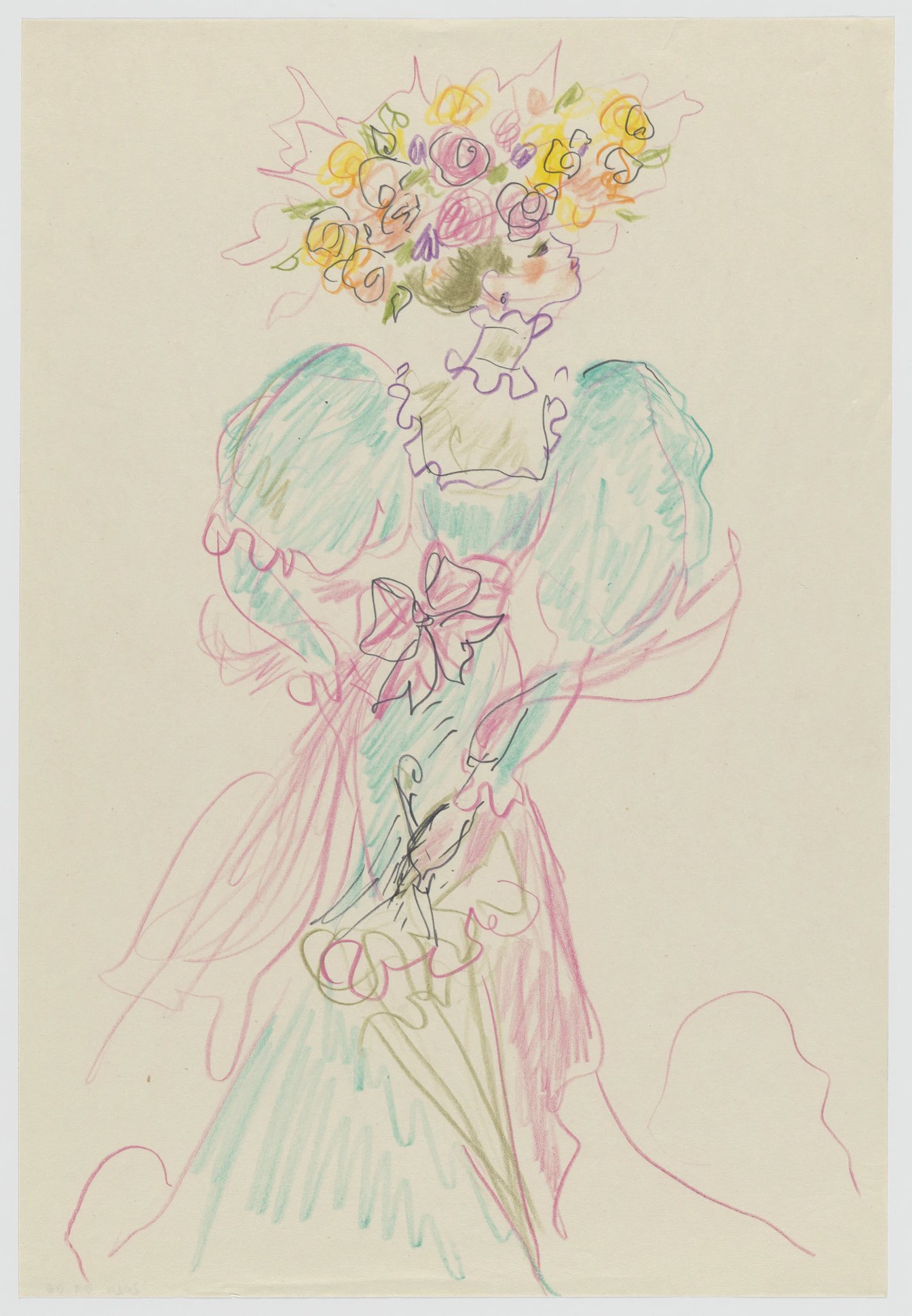 Croquis de femme portant une coiffe en fleurs, 1976, Crayons de couleur sur papier, chaque dessin : 30,8 × 21 cm
