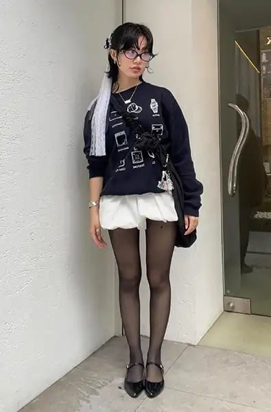 りよん:こちらは、スウェットのカジュアルな上半身と、タイツにパンプスを合わせた女の子っぽい下半身とのギャップがかわいいコーデ。