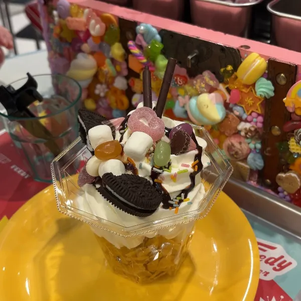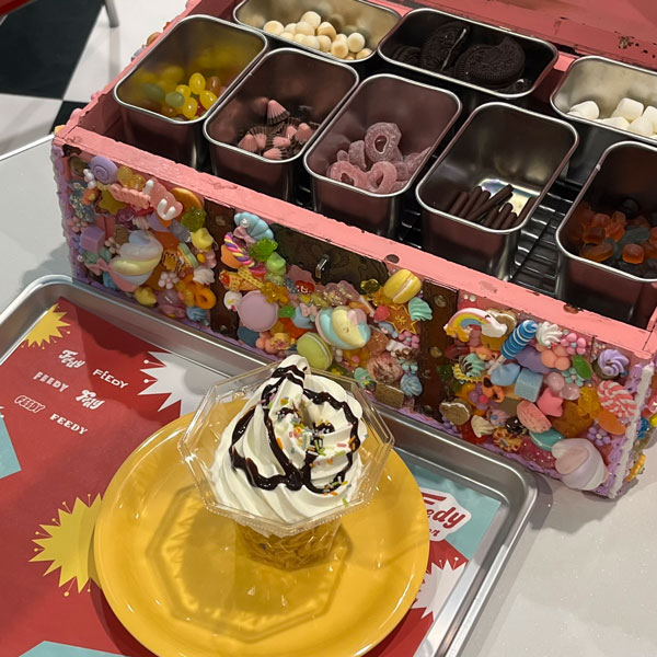 子どもの頃に夢みた人も多いであろうお菓子の宝箱が席に運ばれてきて、制限時間の1分以内なら好きなだけお菓子をトッピングできちゃうんです。約8種類のお菓子の中から、思いのままに好きなものを乗せちゃってOK!