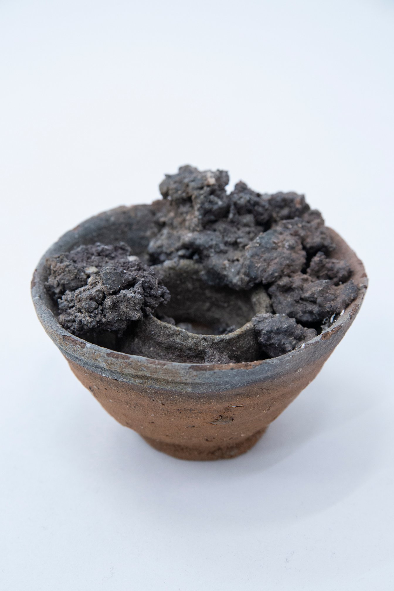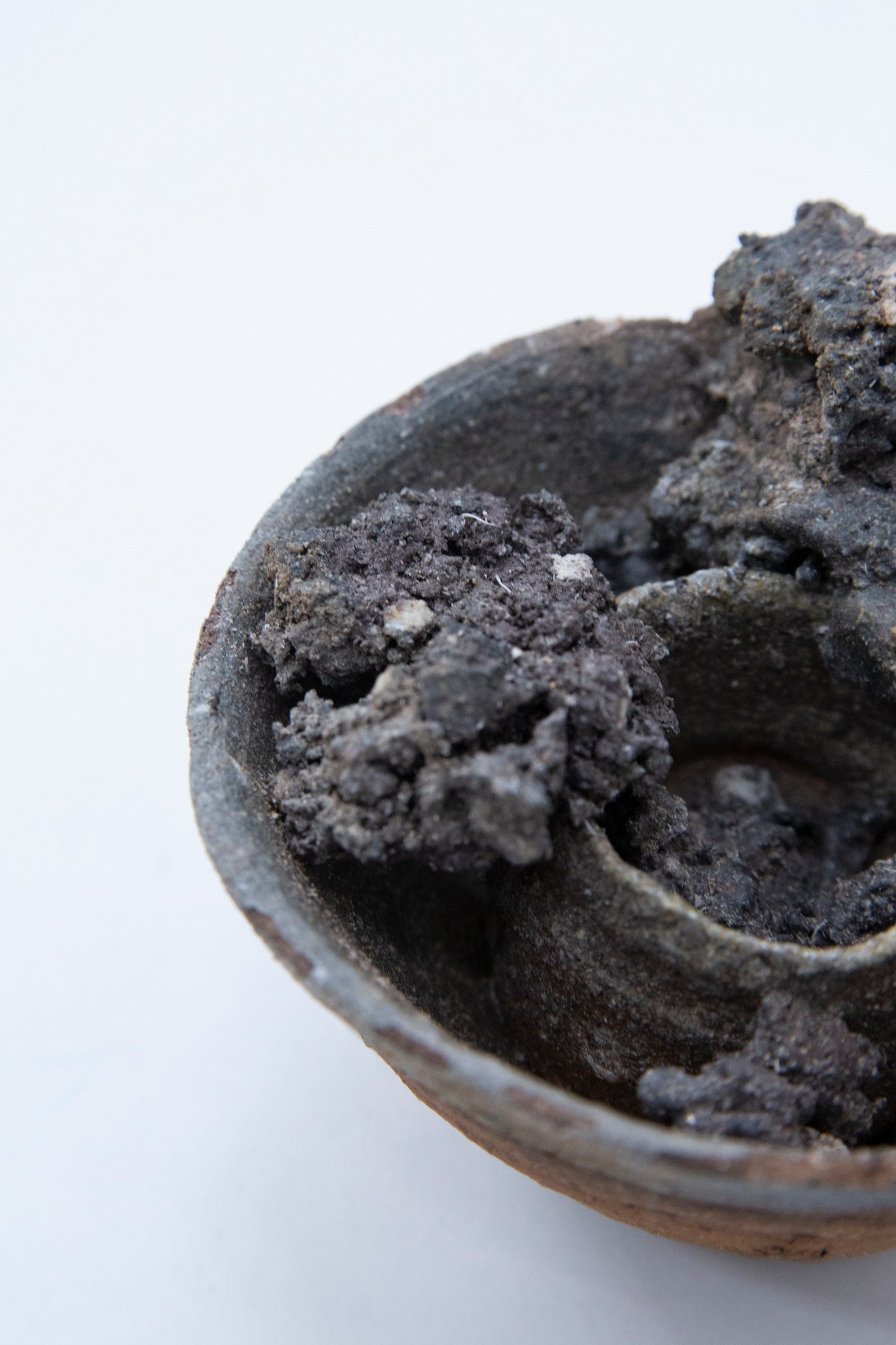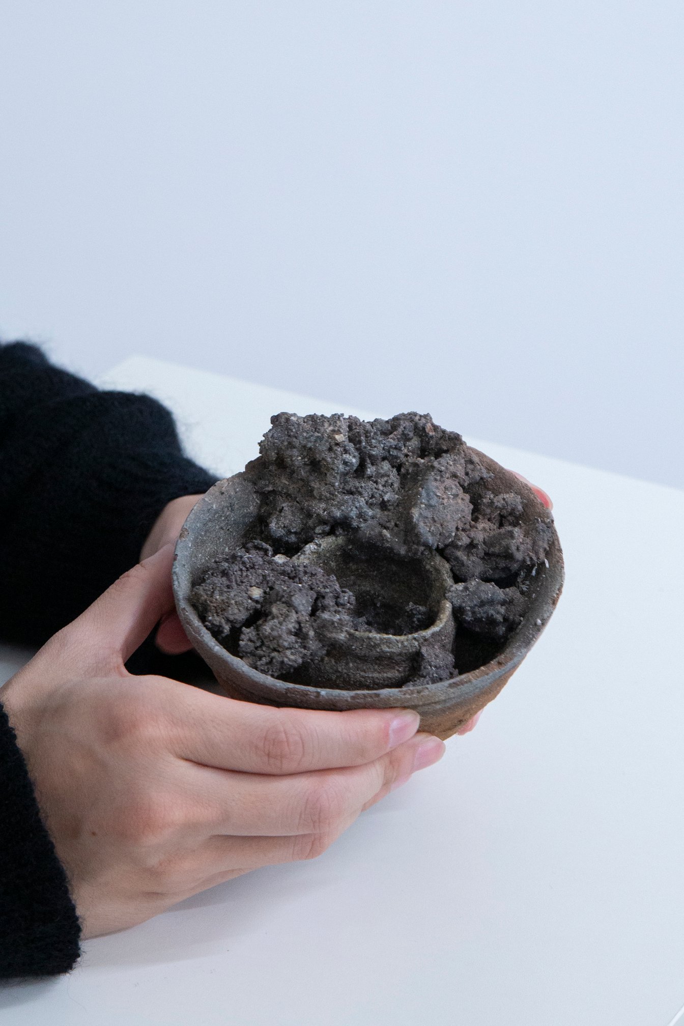 橋爪:木村達哉さんの「手掘り穴窯 土降り碗」です。手に持つとずっしりと重いんですよ。「土降り」とあるように、碗の中には手掘り穴窯(地面をトンネル状にくり抜いた窯)の土が焼く時の温度に耐えられずに溶け落ちて残っています。これはいま主流の電気窯やガス窯だとありえないものです。京都のMtK Contemporary Artというギャラリーで、桑田卓郎さんがキュレーションした展覧会をやっていて、その中にあったこの作品に目が止まりました。無骨なフォルムと重厚感、碗なのに碗として使えない用途のなさに「なんだこれ?」と思って。?