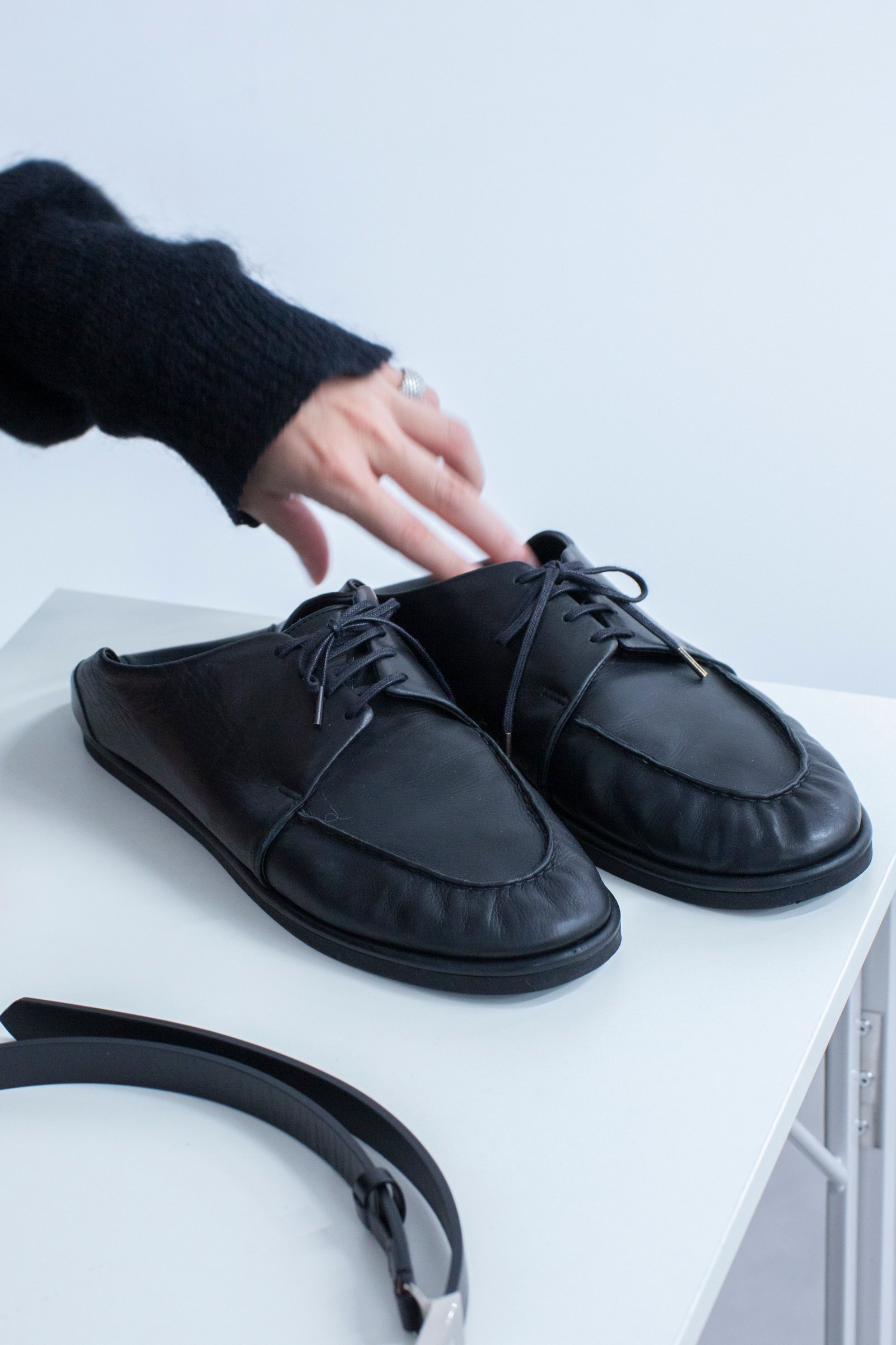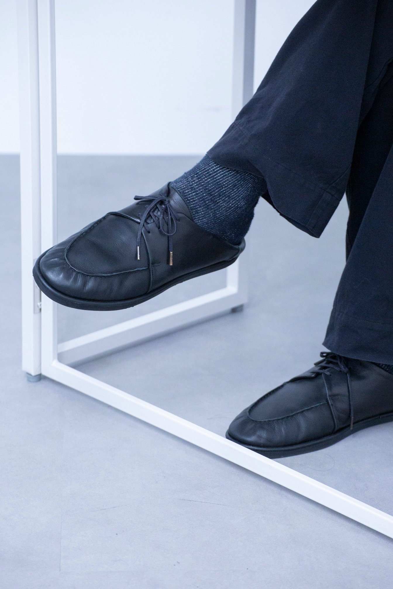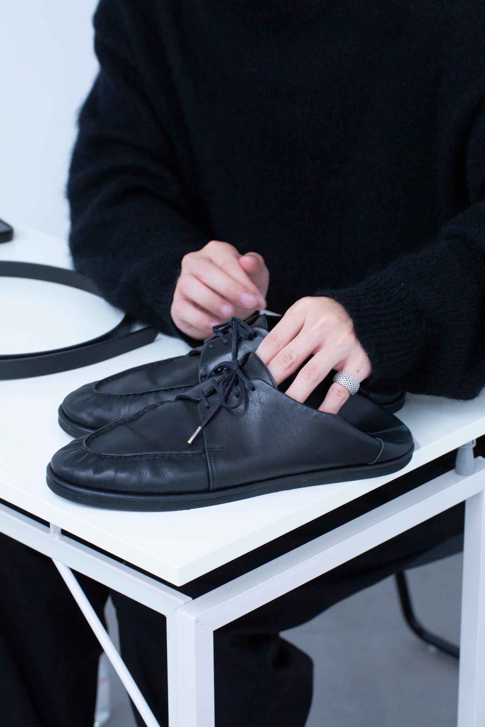 橋爪:ソールが薄く、しかもヒールがないから完全にフラット。ここまでペタンコなのはあまりないから、フォルムとしてすごく好きですね。オーラリーのパンツはクシュッと靴の甲に裾をクッションさせるデザインが多いので、靴はスッと落としていくような緩急の付け方ができるんです。オーラリーの服に一番合うように設計されている靴かな、と個人的には思います。