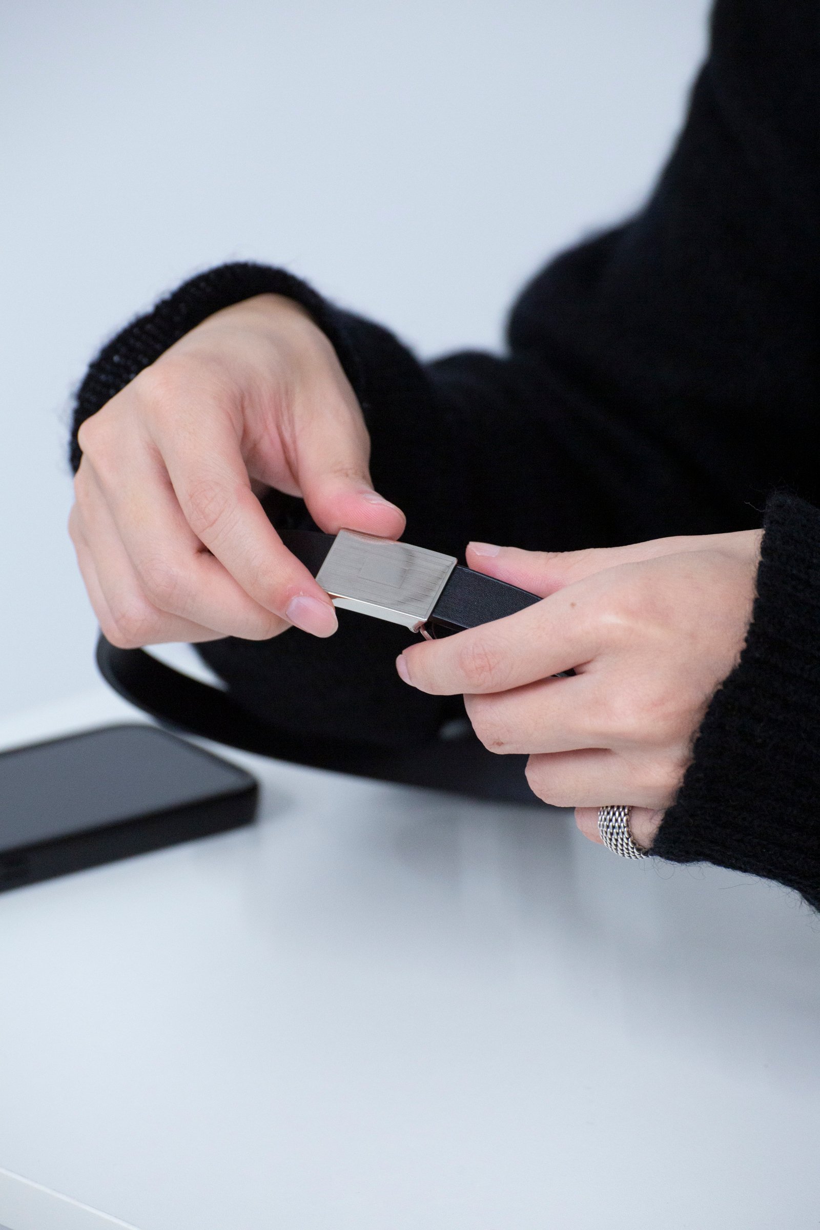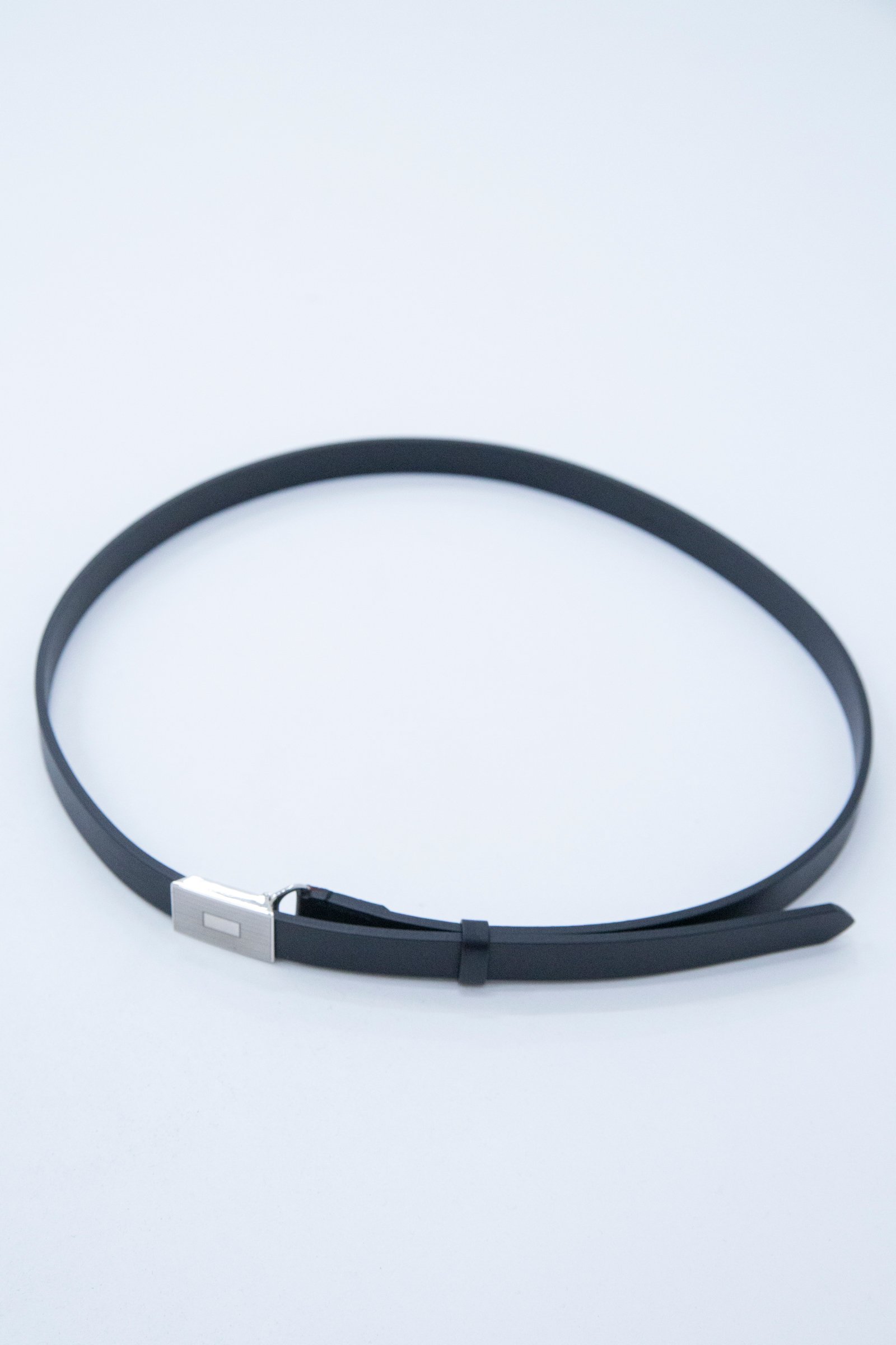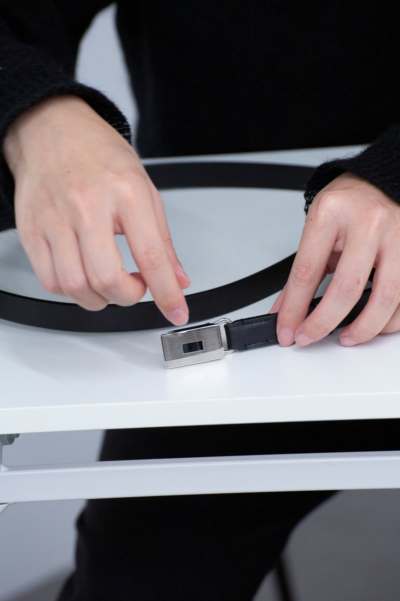 橋爪:これは単穴に通すだけでキュッと止まるスライドベルトです。ベルトってバックル部分が目立ちすぎるとそこに目線が行くし、でも地味すぎても存在感がない。これはシンプルな長方形に薄くヘアラインで模様が入っていて、オブジェ的な美しさがあると思います。サイズが小さく思ったほど目立たないし、ベルト部分も太すぎず細すぎずちょうどいい。いい買い物をしたなと思います。