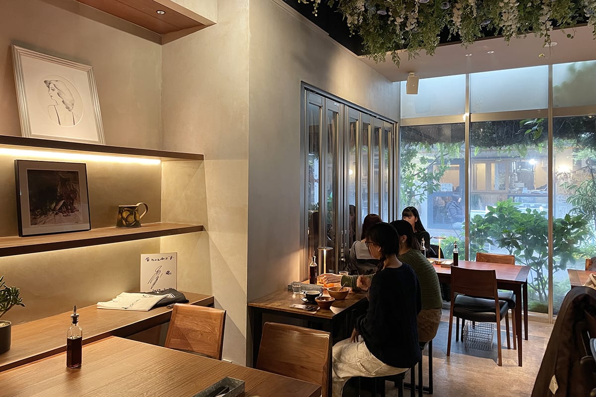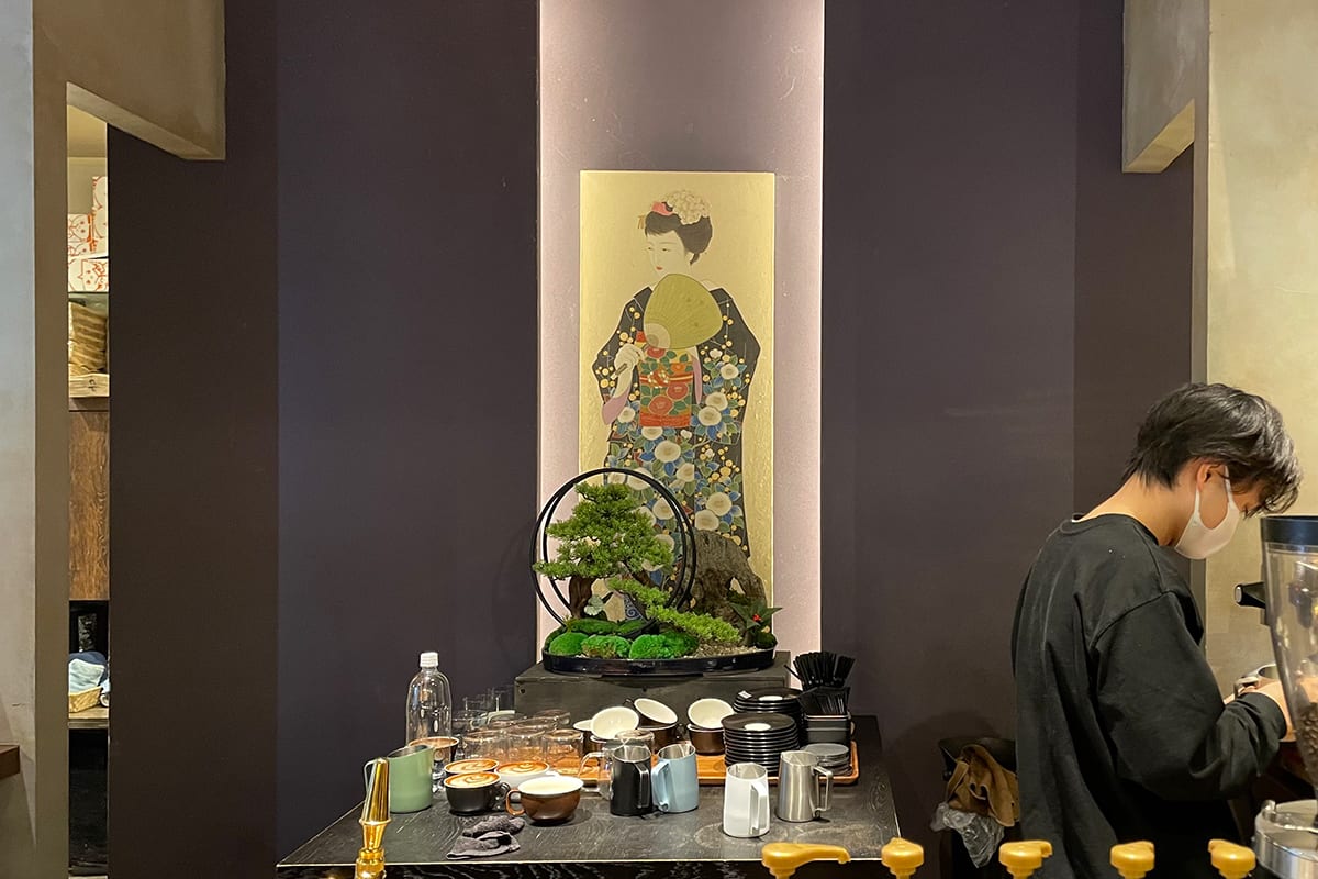 入り口で注文を済ませ、カウンター席へ。店内には美人画や盆栽が飾られ、店奥には熱帯魚が悠々と泳ぐ水槽まで。自然の中に和のテイストが織り込まれ、どことなくジブリの摩訶不思議な世界観に迷い込んだみたいな奇妙な感じがする。