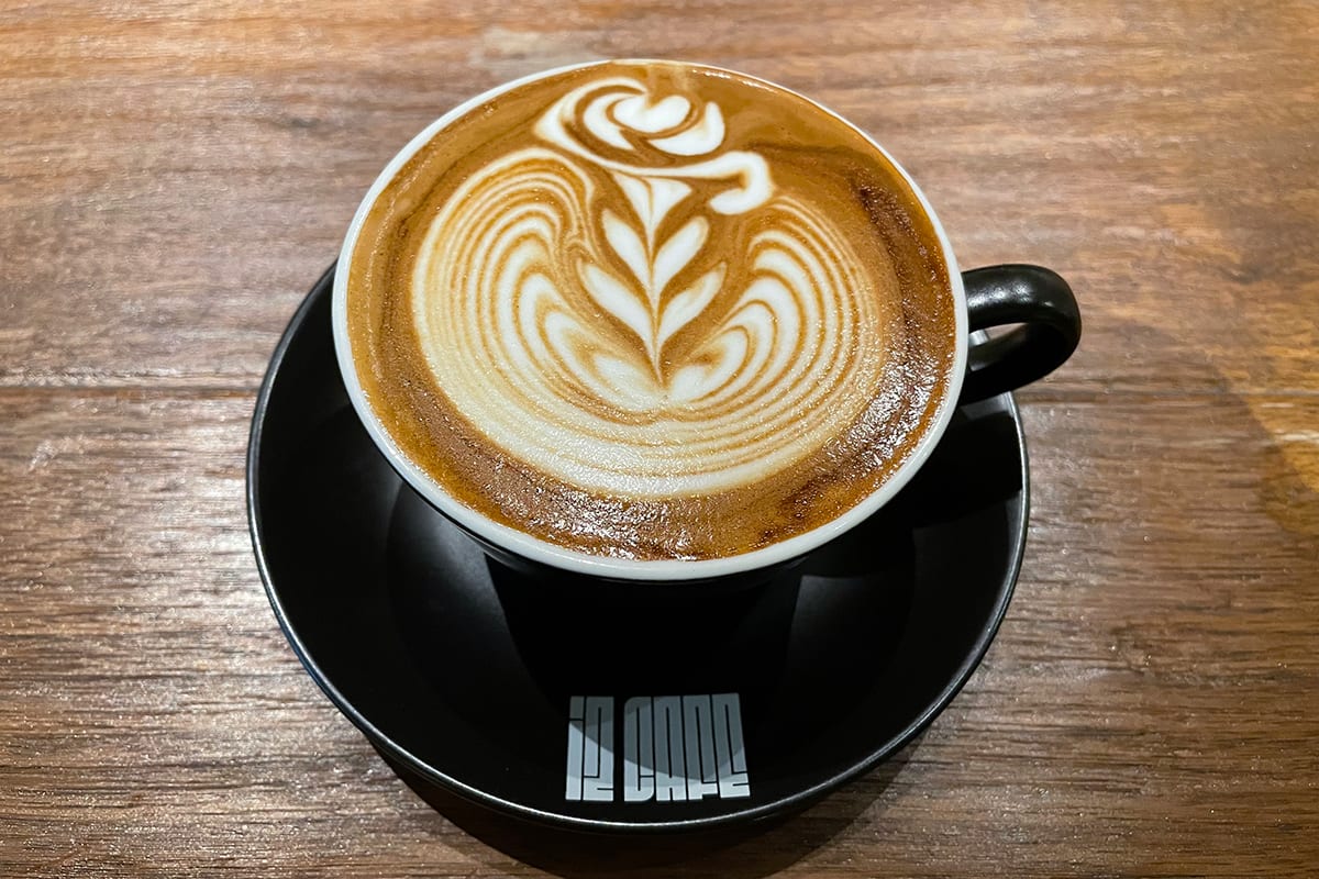 カフェの定番、ホットラテも合わせて注文。薔薇のラテアートとシックなロゴ入りの器が、大人な気分にさせる一杯。栗のような深い香りで、最後まで森林浴気分を味わえた。
