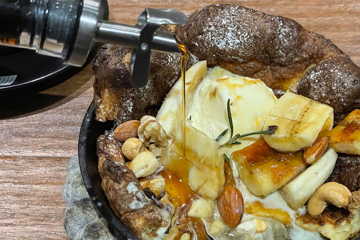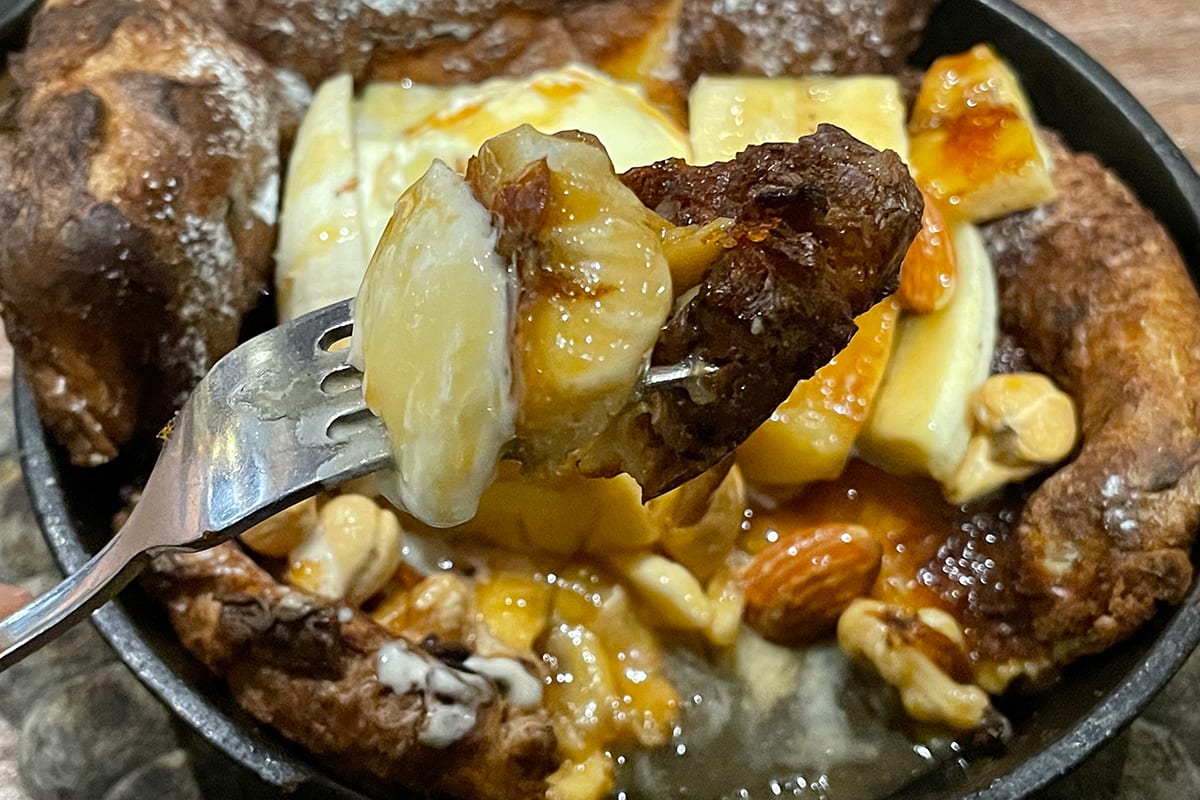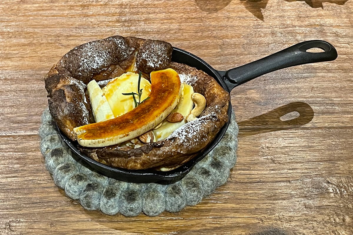 待つこと15分ほど。こちらが今回注文した「キャラメルバナナナッツ」のダッチベイビー。(ひとつひとつじっくりと焼くため、混雑時には30分ほど提供時間に余裕を持って◎)