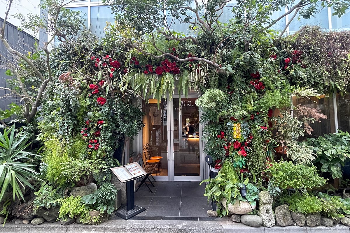 南青山の路地裏。急な下り坂を慎重に歩いていると、突如目の前に「森」が出現。もさもさ生い茂る植物に驚いて見渡していたら、ひょっこり入り口が登場し、無事「i2 cafe」に到着したのだ、と気付いた。