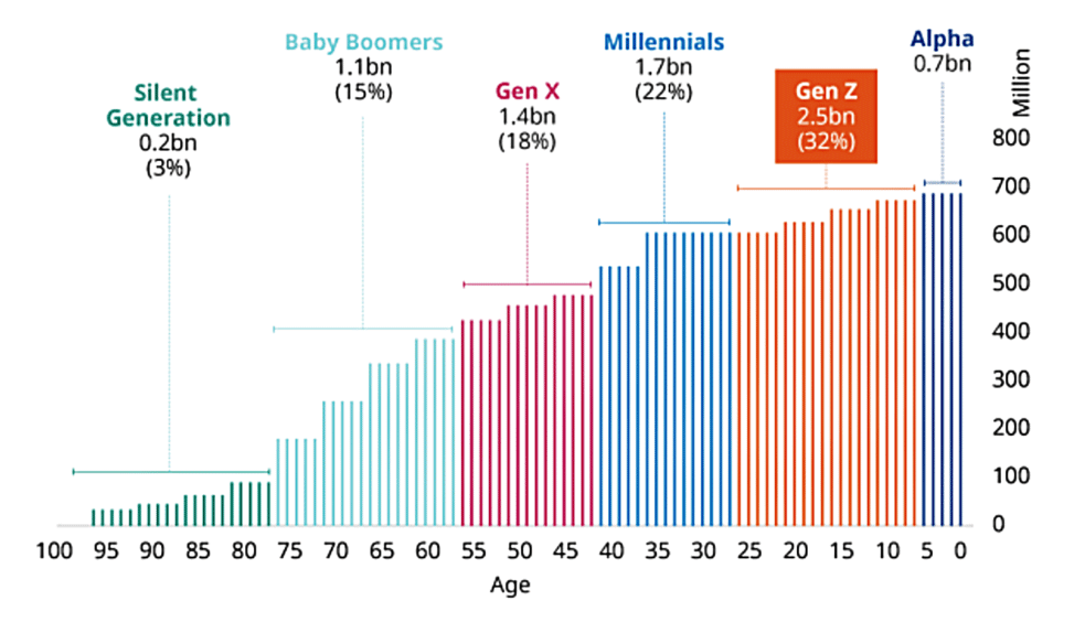 Z世代は世界人口の約1/3を占めるボリュームゾーン. 参照: UN, Euromonitor