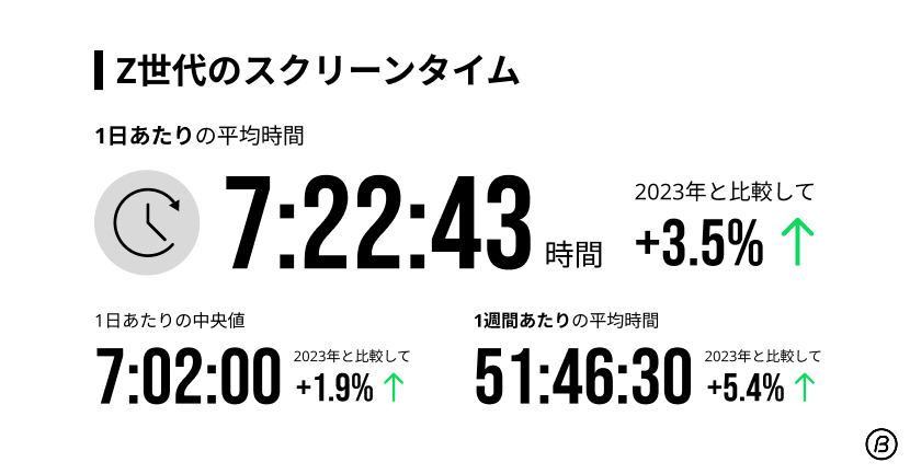 Z世代の1日のスクリーンタイム(スマホ等で画面を見ている時間)は、平均7時間22分43秒(2024年)となっており、前年度に比べて15分以上増加している。