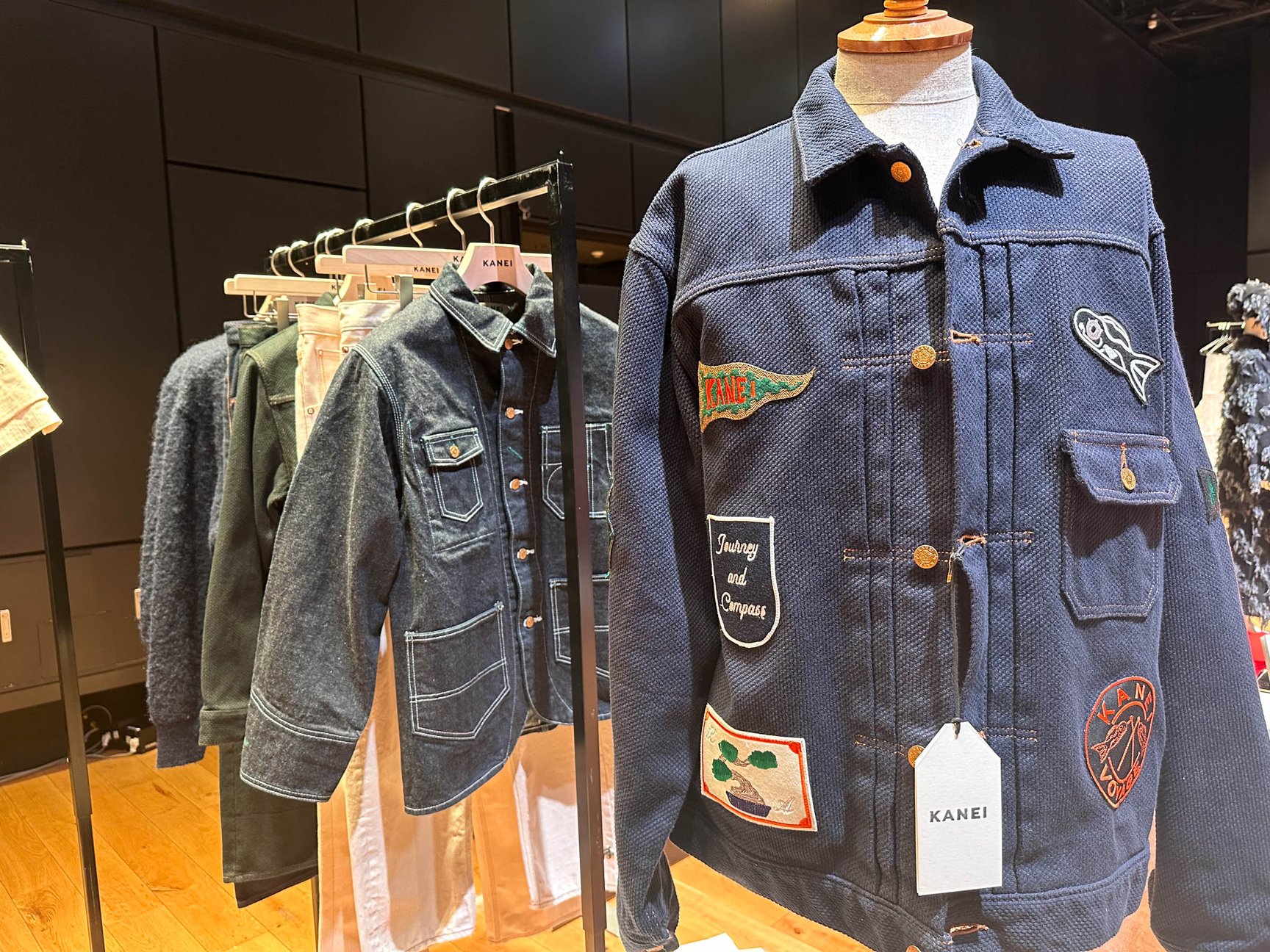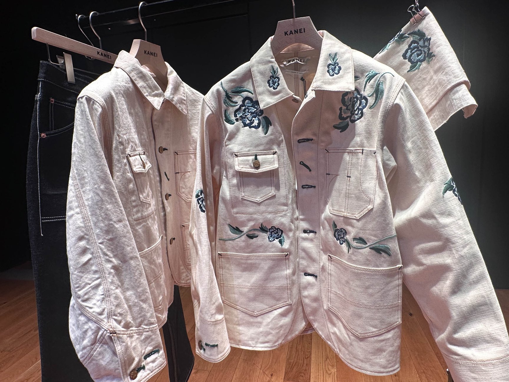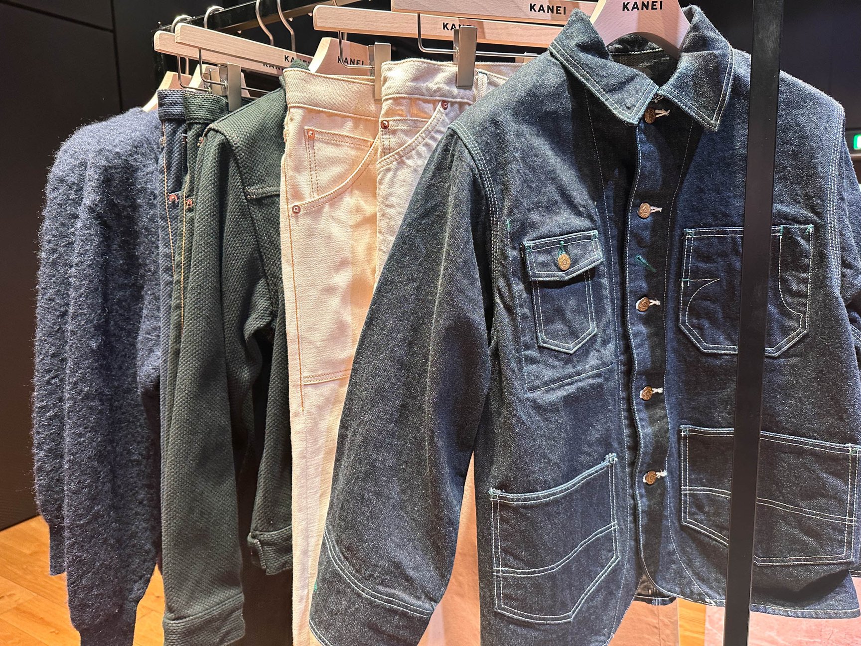 1960年代の鉄道員の制服のディテールをサンプリングしたデニムのカバーオール(6万2800円)や、生成りのセルビッジデニムに青い牡丹の刺繍を施したデニムジャケット(7万8500円)、“大戦モデル”のディテールを引用し、柔道着などに用いられる刺し子織の生地で仕上げたジャケット(5万3800?7万6500円)など、古着のデニムアイテムに着想したアイテムを中心にラインナップする。なお、生成りのデニム生地にはフェアトレード素材を採用している。