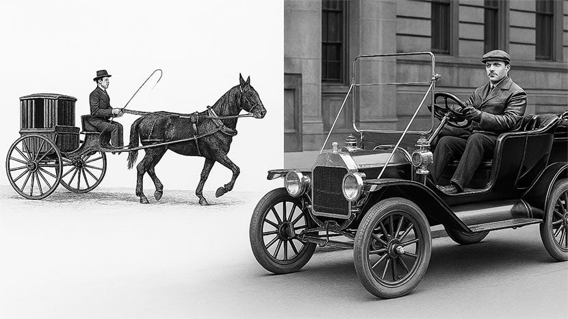 これはまるで、かつての馬車がエンジンによって自動車に置き換えられた歴史と似ている。