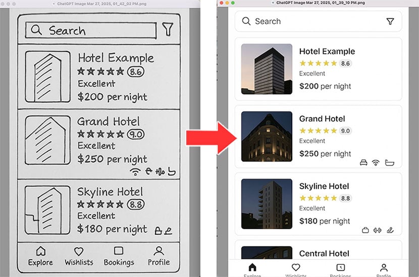 手書きのスケッチ (左) をChatGPTにアップロードすればアプリのUIを生成してくれる
