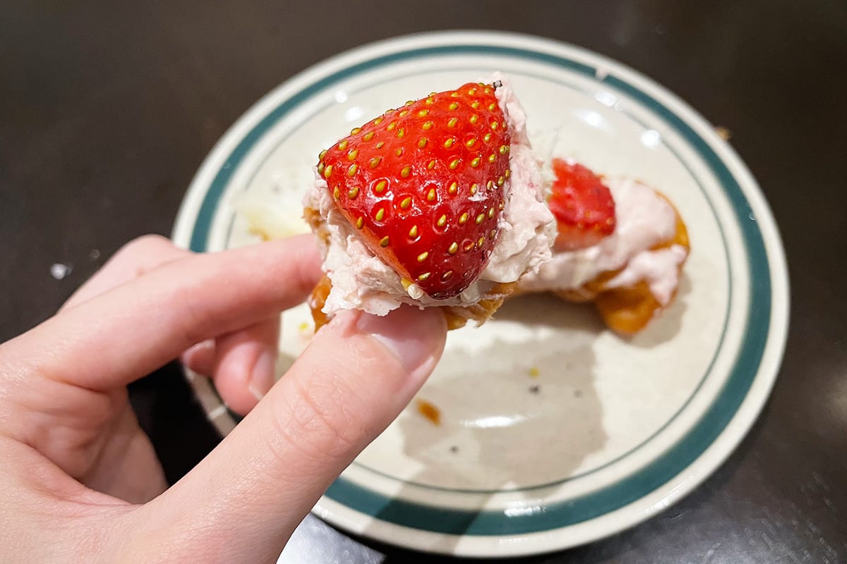 4月末までの期間限定「ストロベリーホワイトリボン」もいただきます。数種類あるイチゴ系フレーバーの中でも、ピンク色のクリームが桜のようにかわいくて選んだこちら。真っ赤なイチゴと甘酸っぱいクリームを一緒にぱくり。まるでショートケーキのような味わいで、見た目ほど甘さも強くなくとってもおいしい。
