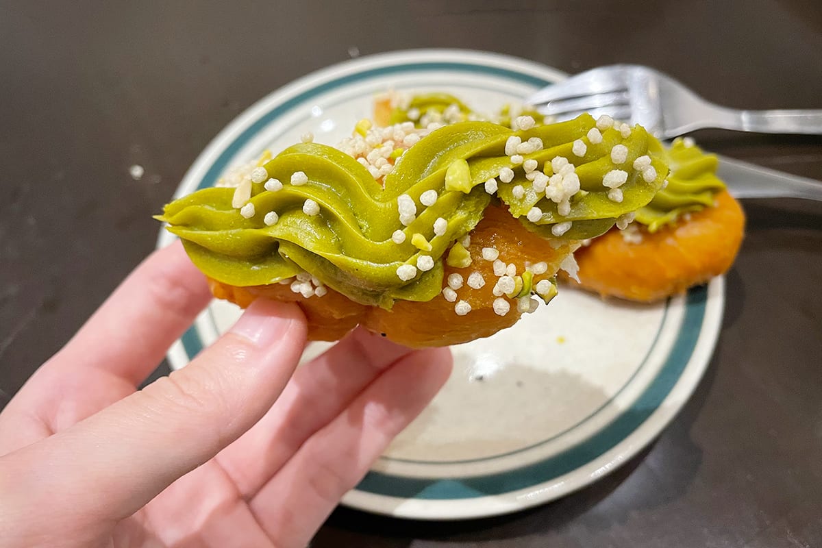 お次は、鮮やかなグリーンの「ピスタチオ」。ひとくち食べると、ピスタチオのこっくりした深い味わいが大人な気分にさせてくれる。もったり重めのクリームに、カリカリのトッピングがマッチして食感も楽しい。
