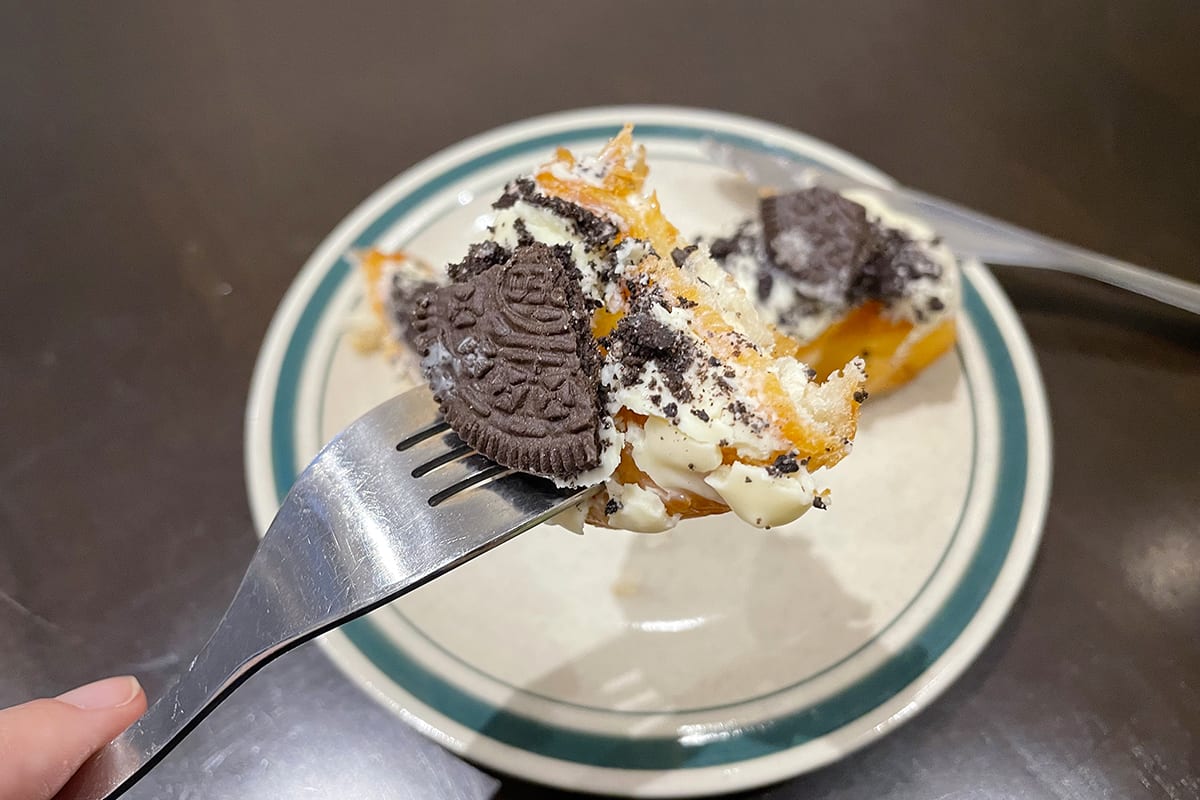 早速「オレオチョコ」からいただきます。サクサクもっちもちの生地にたっぷり染み込んだ甘さが、噛みしめるたびにジュワーっと口の中に広がっておいしい!オレオの白いクリーム部分が大好物なので、たっぷりのホワイトチョコまでもそれのように思えてきて、食べていて幸せ気分になる一品。