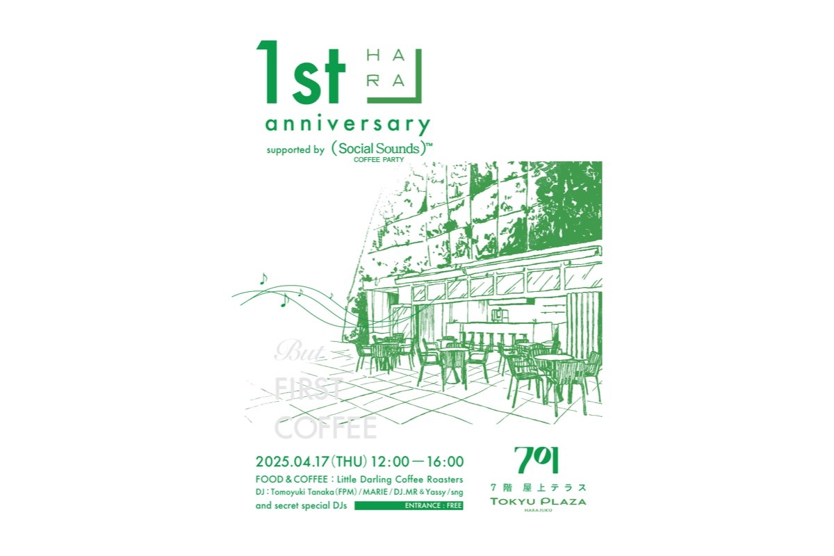7F?イベントスペース「701」では、コーヒーと音楽をテーマにしたオープンパーティー「SOCIAL SOUNDS」によるDJパーティーが開催。田中知之(FPM)やモデル/デザイナーのマリエなどがDJを務めるほか、「Little Darling Coffee Roasters」によるフード&ドリンクも合わせて楽しめる。