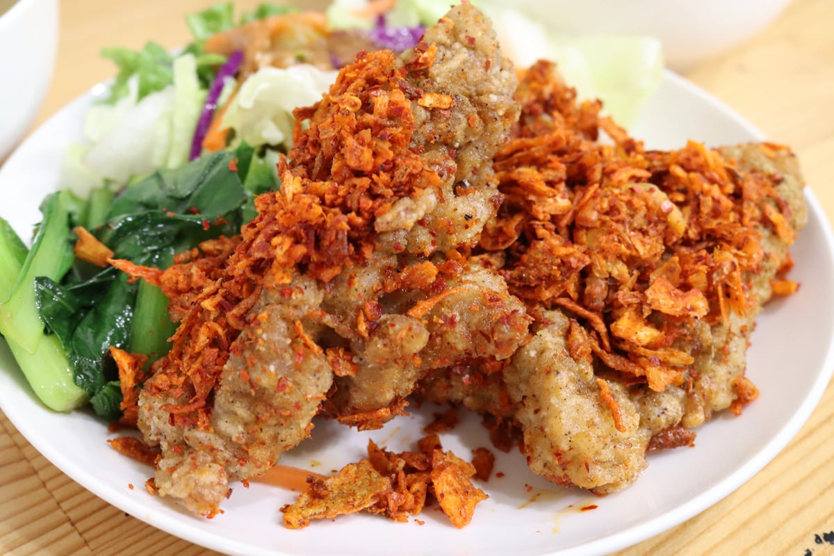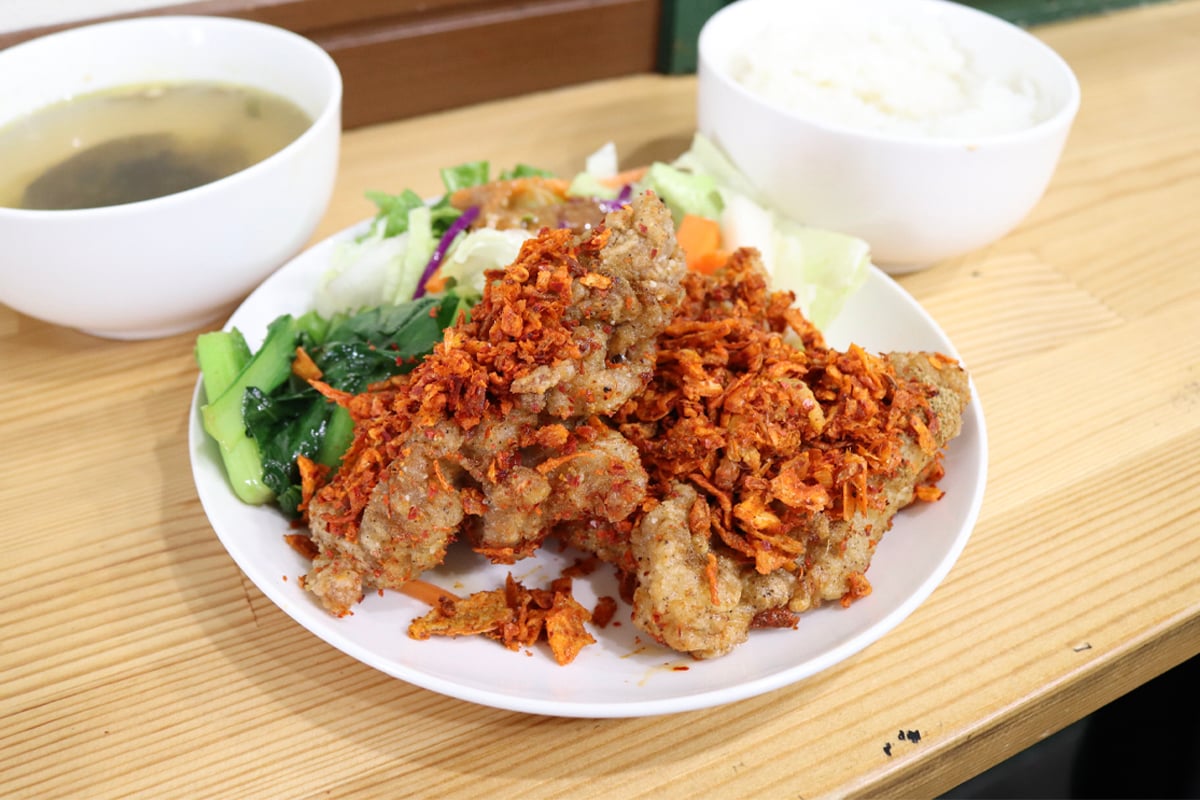 ピリっと辛いけれど、フライドガーリックの香ばしさとエビの旨味が相まって、ただ辛いだけではなくとにかくおいしい!。濃厚だけど、決してしつこくないのでライスと合わせると、そりゃもう箸が止まらない。付け合わせの野菜の味付けがまた絶妙で、チキンの濃い味わいをさっぱりと中和してくれる。まさに旨辛の王道と言える一皿。クセになって、何度でも食べたくなるおいしさだ。