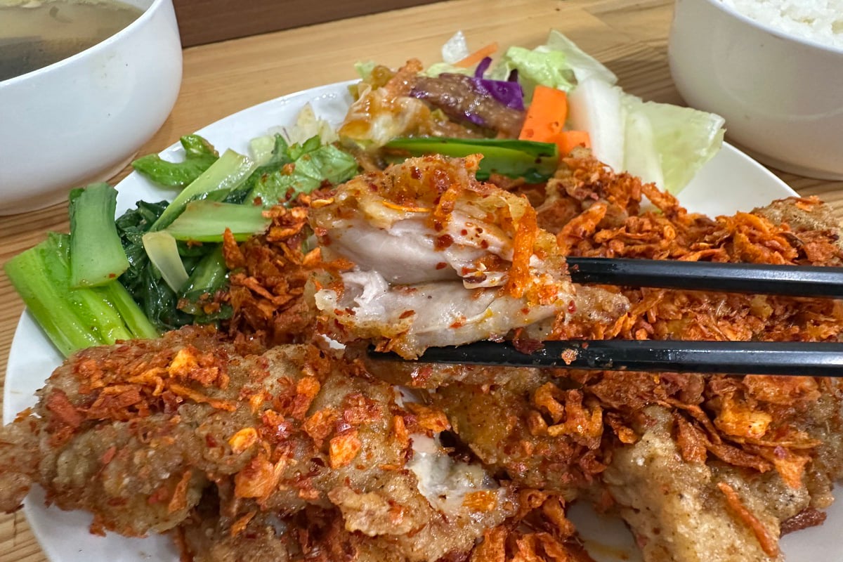 今回頼んだのはもちろん目的だった名物の「毛沢東プレッシャーチキン定食」。そのインパクト抜群なメニュー名が気になってしょうがなかったのだが、味のインパクトはそれ以上。
