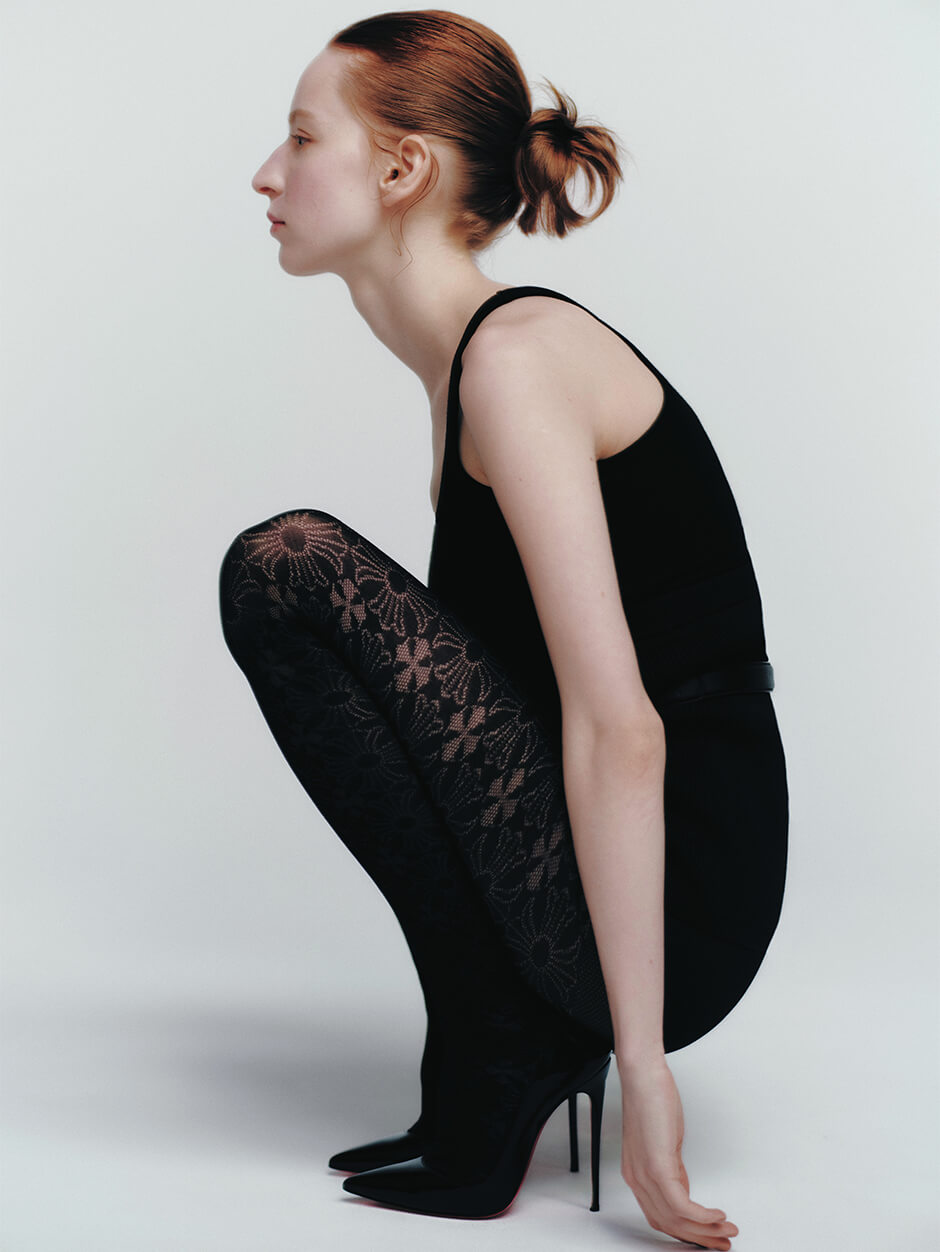 dress ¥106,700 by CHROME HEARTS CHROME HEARTS TOKYO,tights ¥1,650 by CECILIA DE RAFAEL POCO A POCO, top and ribbon stylist’s own