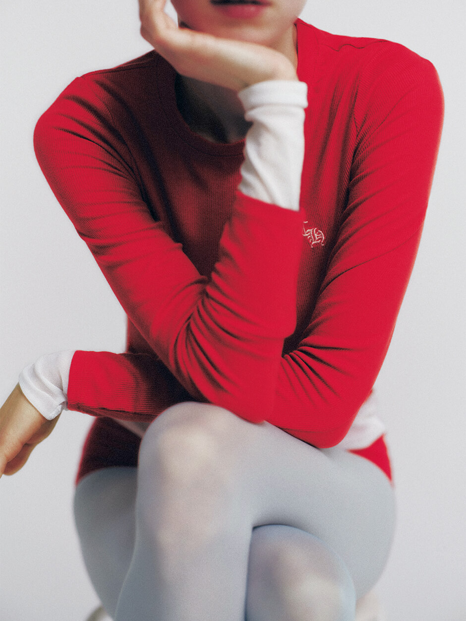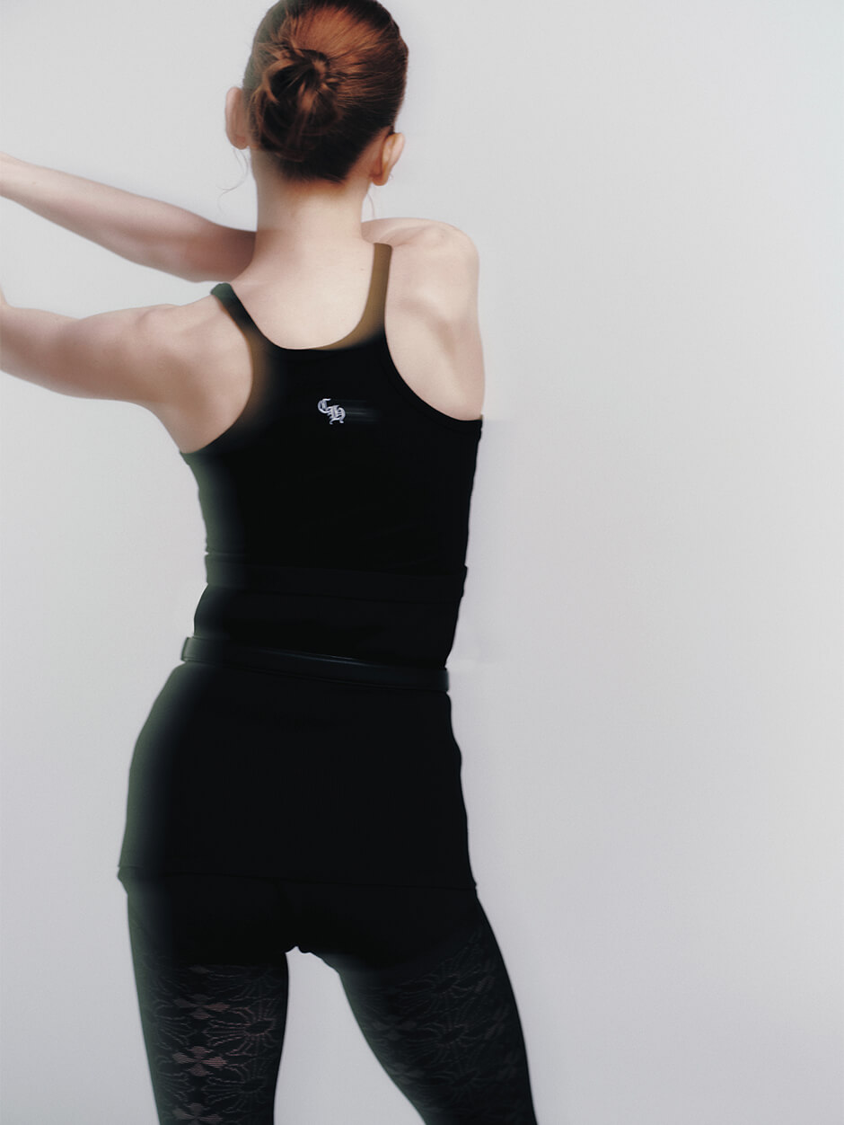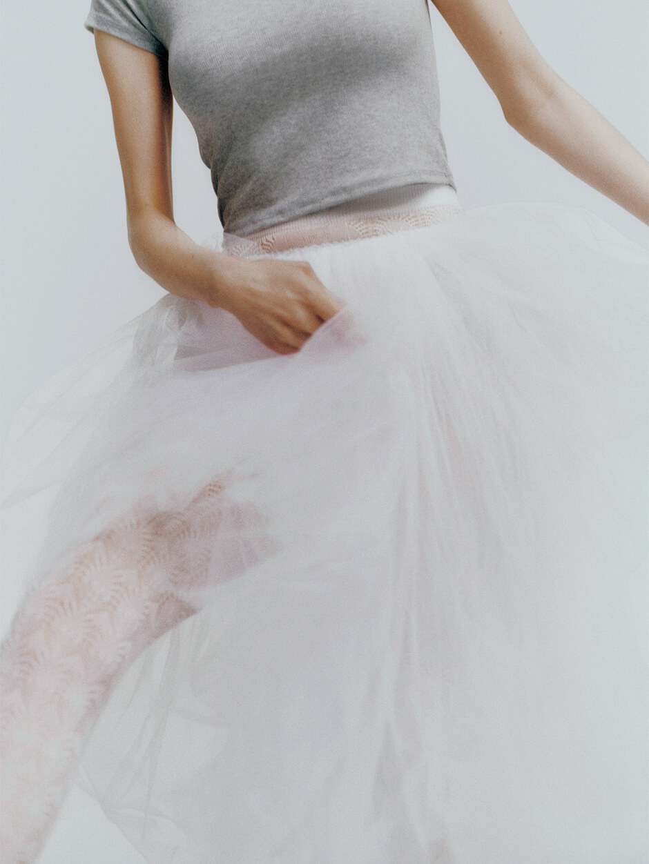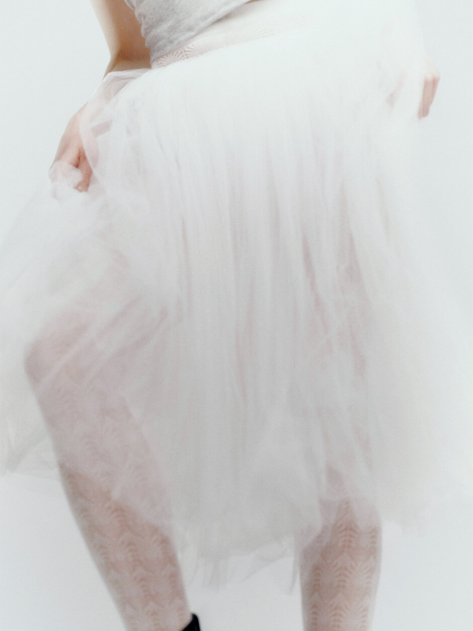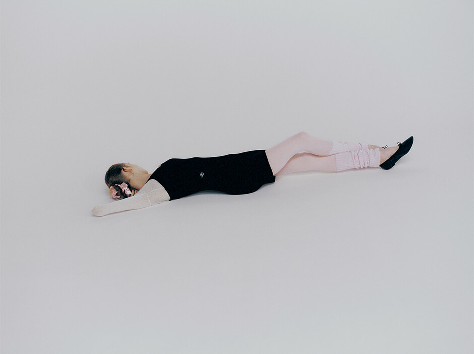 dress ¥106,700 by CHROME HEARTS CHROME HEARTS TOKYO,tights ¥1,650 by CECILIA DE RAFAEL POCO A POCO, leg warmers reference item and shoes ¥60,500 by REPETTO LOOK.INC BOUTIQUE DIVISION, top and ribbon stylist’s own