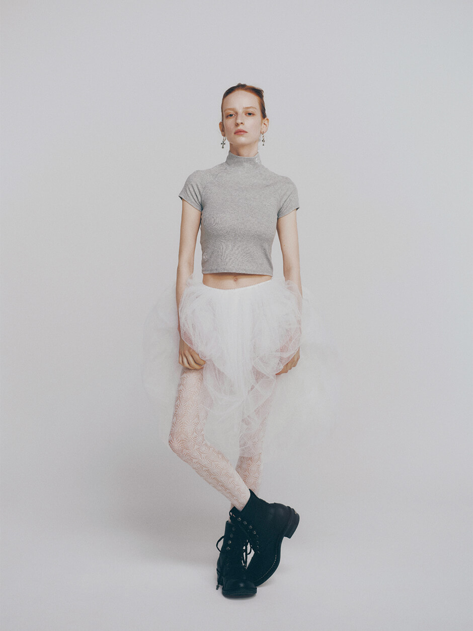 top ¥85,800, earring (each) ¥149,600, boots reference item by CHROME HEARTS CHROME HEARTS TOKYO,skirt reference item by REPETTO LOOK.INC BOUTIQUE DIVISION, shorts and tights stylist’s own