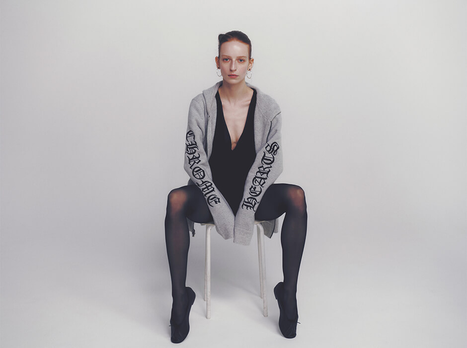 hoodie ¥708,400 and earring (each) ¥85,800 by CHROME HEARTS CHROME HEARTS TOKYO,shoes ¥60,500 by REPETTO LOOK.INC BOUTIQUE DIVISION, bodysuit and tights stylist’s own