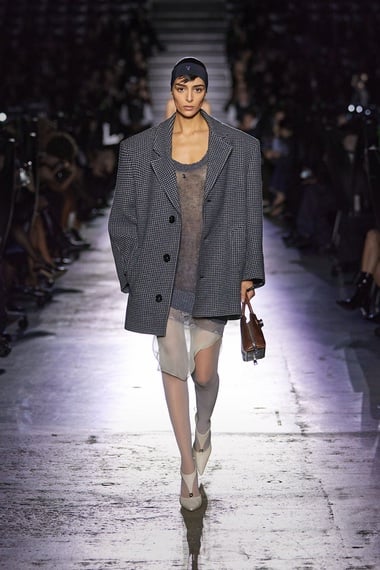 象徴的なのは、「ジバンシィ」が発表したテーラーリングのミニドレス。大きく張り出した肩、太めの袖は強さを感じさせるが、がちがちに硬くない。柔らかさをプラスするのは、曲線的なウエストや黒地に際立つ白のライン。裾を折り畳んだようなAラインのスカート部分は、布の動きが感じられて軽やかに見える。強さと軽快さを併せ持っている点が特徴だ。