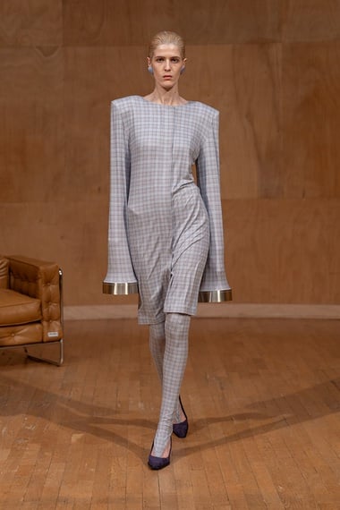 「ステラ?マッカートニー」のテーラードスーツも、今を生きるポジティブな女性像が表現されている。ショー会場はオフィスのような空間。オフィスチェアやコピー機などが置かれた空間で、スーツ姿のワーキングウーマンたちが登場した。パワーショルダーのジャケットは80年代をほうふつさせるが、キラキラ光るビジューのフリンジが揺れてリズミカル。どこか遊びが感じられる。大きな肩のパイソンドレスは、落ち感のある素材で軽やかに仕立てられている。
