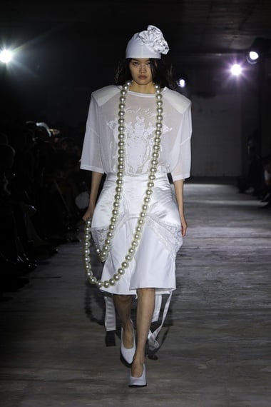 日常アイテムにパワーショルダーを取り入れる表現は、若手デザイナーに多かった。パリで発表するニューヨーク発の「ヴァケラ」は、白いTシャツに大きな肩パッドをプラスしてパワフルなスタイルに仕上げた。ベースとなるアイテムはカジュアルだが、かっちりとしたショルダーラインがオンのスタイルに引き上げる。全てのアイテムを巨大化させるアイデアで、Tシャツもパールネックレスもブラもかなり大きい。楽しいアイデアが、パワフルなスタイルを形作っている。