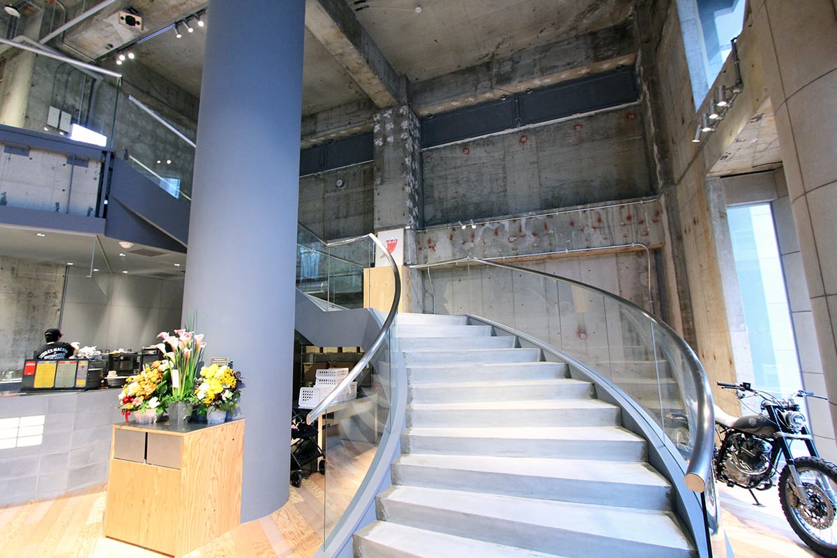 店舗に入ると高い天井の吹き抜けと巨大な螺旋階段がお出迎え。このダイナミックさは他のロケーションでは味わうことがなかなかない。