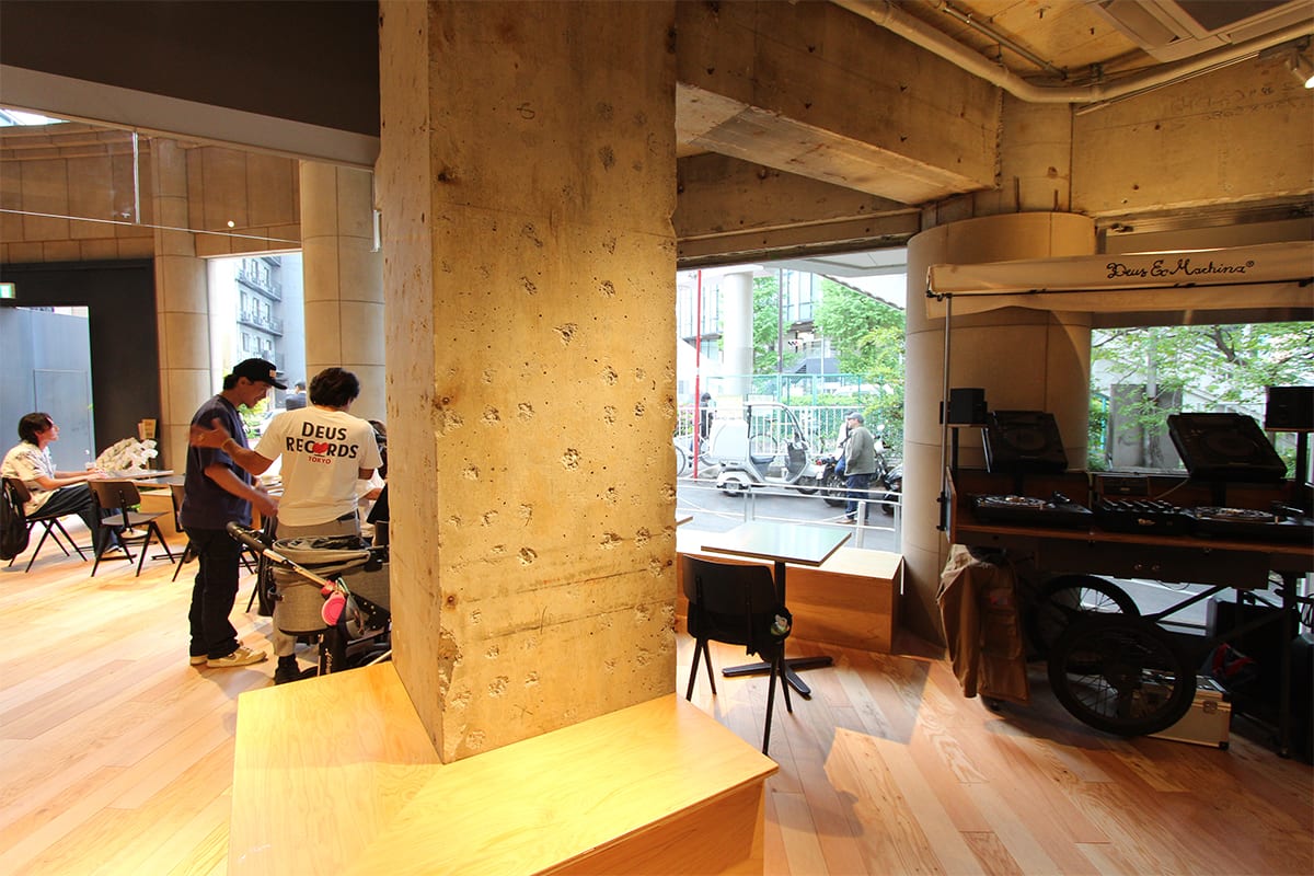 DJブースも完備。Deusがショップイベントを行う際に使っていたワゴンカートのDJブースを常設する。たまたまDJの人が来店して、ノリでプレイすることもあるかもしれない。そんな自由なノリもDeusらしく魅力的。