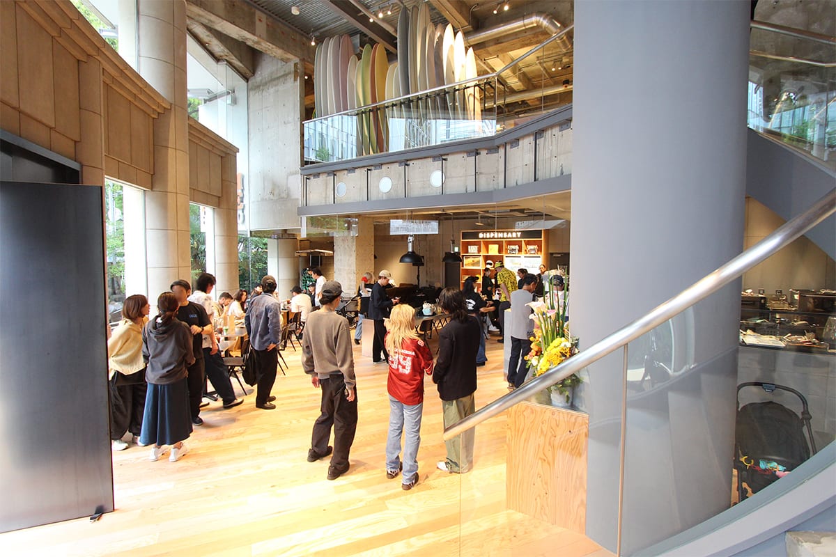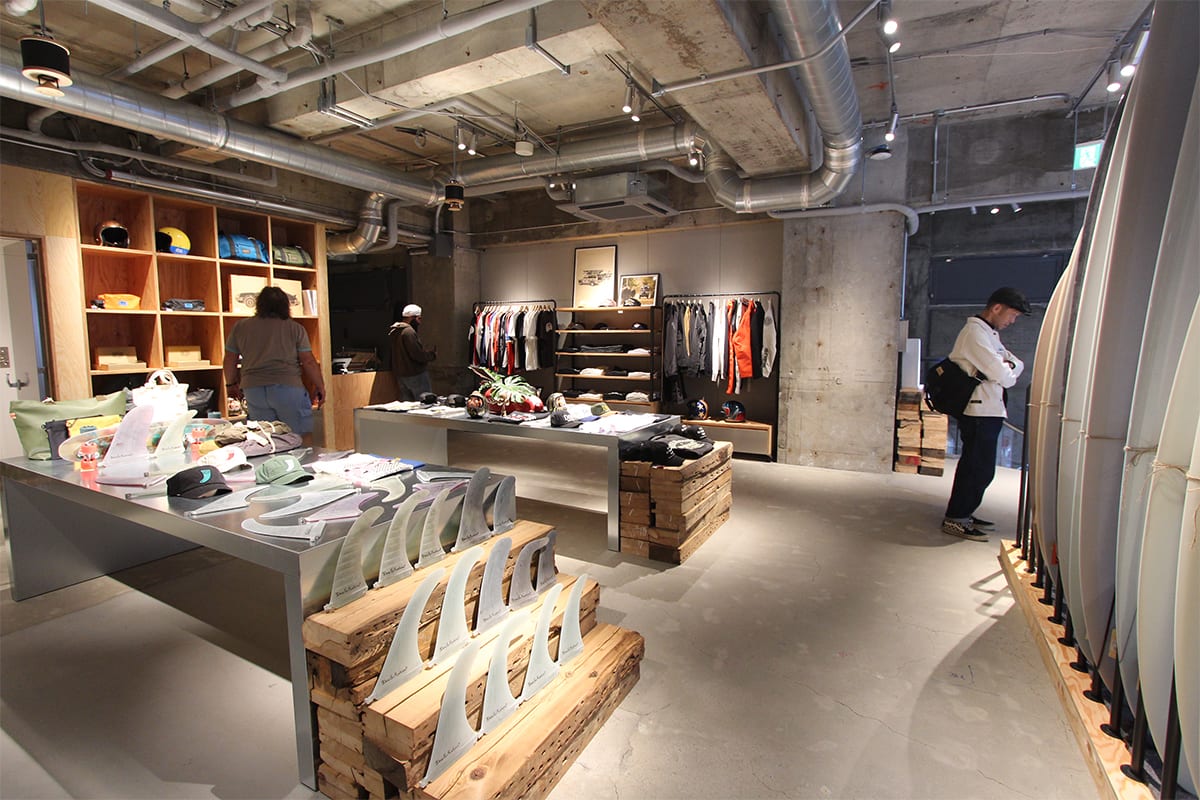 サーフボードやウェットスーツも取り揃え、まるでサーフハウス。吹き抜けから見下ろす外の景色や店内も開放感があって心地よく、ショッピングも自由なノリで楽しくできそう。