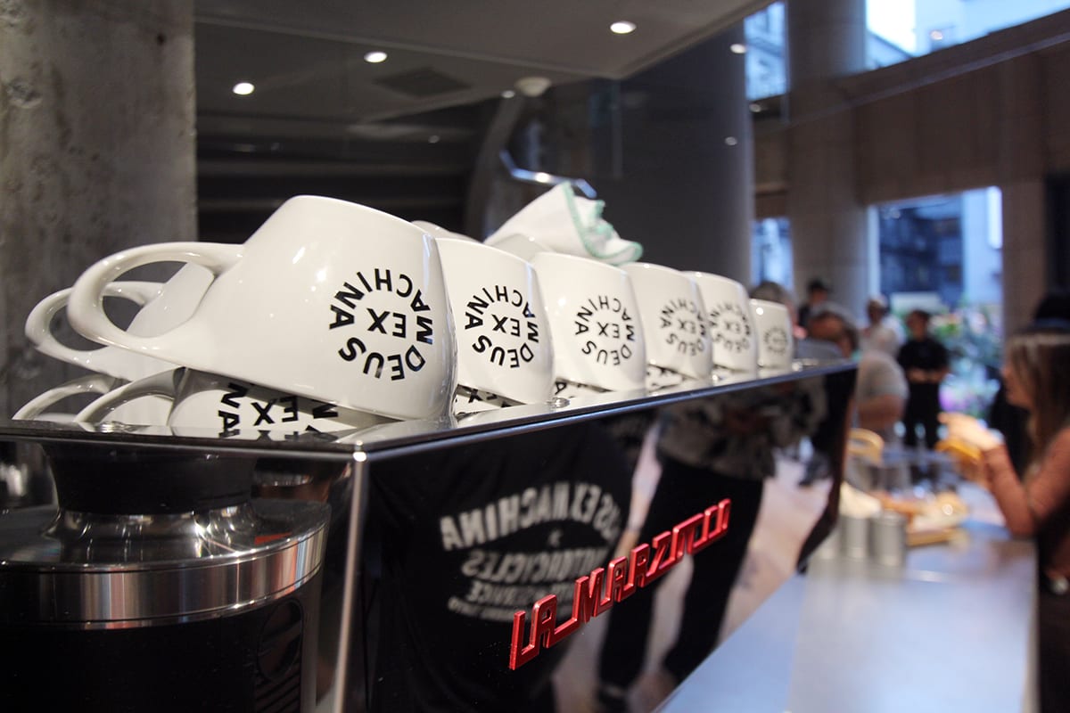さりげなく置かれたバイクや日本のTRUCK Furniture とL.A のStephen Kennが手がけたという、存在感あるカスタムソファ、バイクのガソリンタンクをフラワーベースとしてテーブルに置いていたり。細部に至るインテリアもカッコ良く、さらりとDeusのブランドの世界観を落とし込んでいたのが好印象。そのバランス感とセンスはさすが。