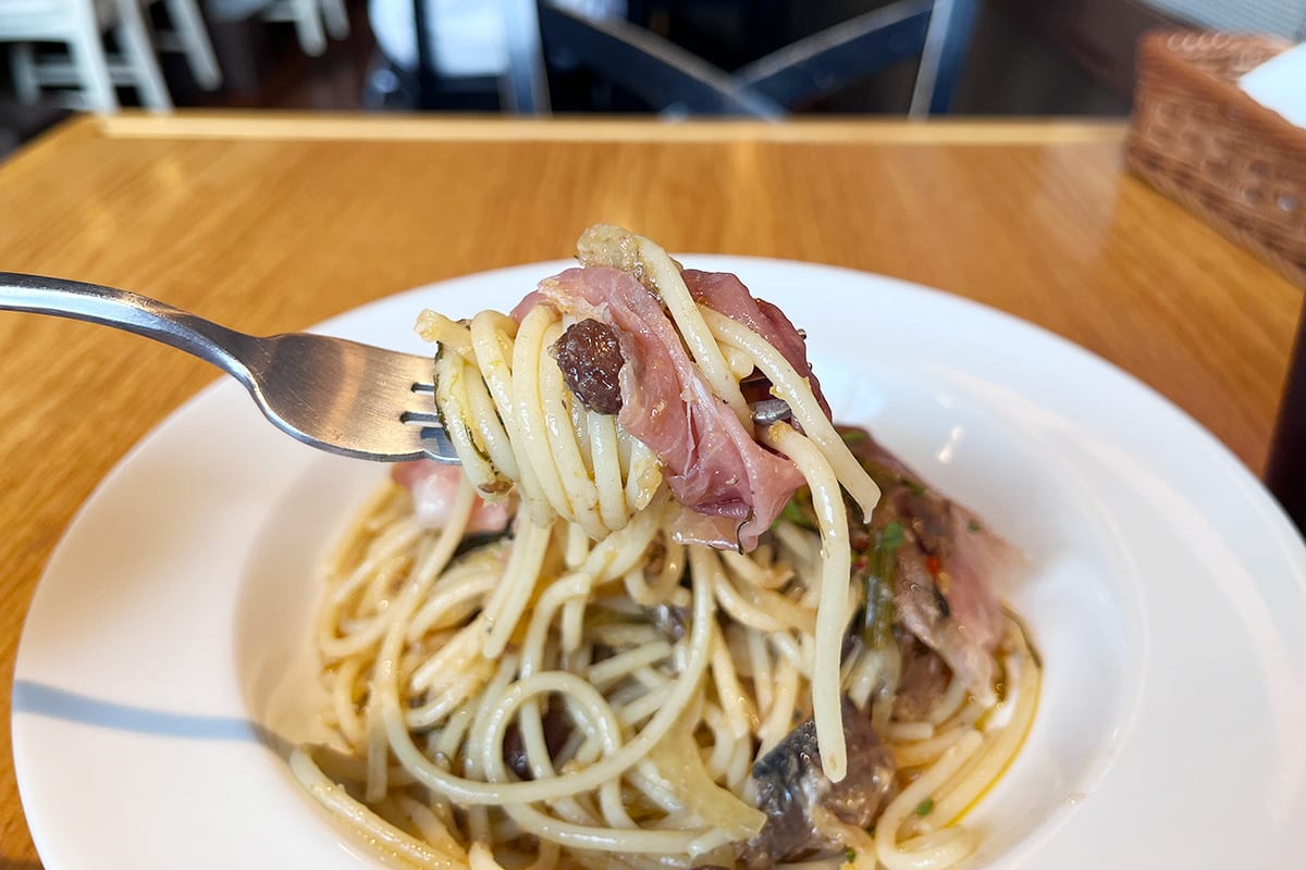 お店の押しであり看板パスタは「絶品アマトリチャーナ」のようで、初来店はたぶんこれを食べておけば間違いない!のだけれど、今日はトマトの口でなかったため、というか個人的に好きなのでどこのパスタ屋に行っても頼んでしまうオイルベースのパスタ「イワシとフェンネルのシチリア風」、いわゆる“シチリアーナ”をチョイスした。