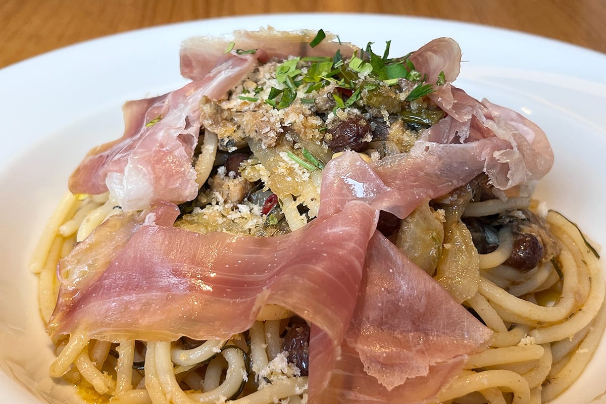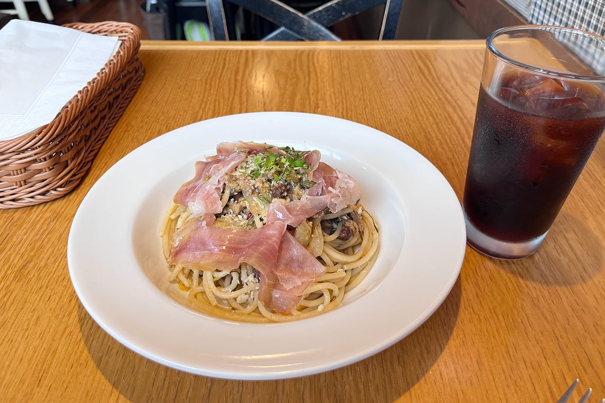 トッピングも卵や、生ハムが選べるので、せっかくならと相性が良さそうな生ハムをトッピング。パスタが到着し、見た目だけでおいしいのがわかる出立ちだ。