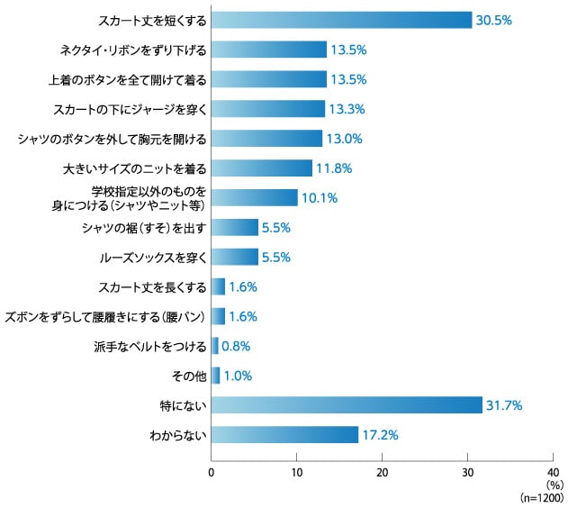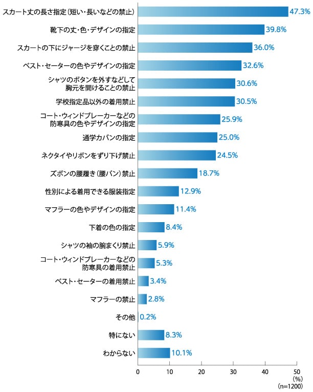 学校の服装規定で定められているものについては、「スカート丈の長さ指定」(47.3%)や、「スカートの下にジャージを穿くことの禁止」(36.0%)、「シャツのボタンを外すなどして胸元を開けることの禁止」(30.6%)などの着用方法に関する項目のほか、「ベスト?セーターの色やデザインの指定」(32.6%)、「靴下の丈?色?デザインの指定」(39.8%)、「学校指定品以外の着用禁止」(30.5%)など、制服以外の衣類に関する自己流のアレンジを禁止する規定も多く挙がった。