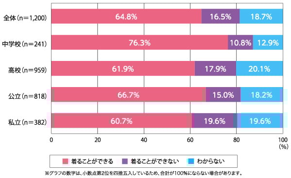 また、性別にとらわれないジェンダーレス制服の着用許可については、自分が着たいタイプの制服を「着ることができる」と回答したのが、中学校で76.3%、高校で61.9%となり、高校に比べて中学校での服装の自由度が高い結果となった。