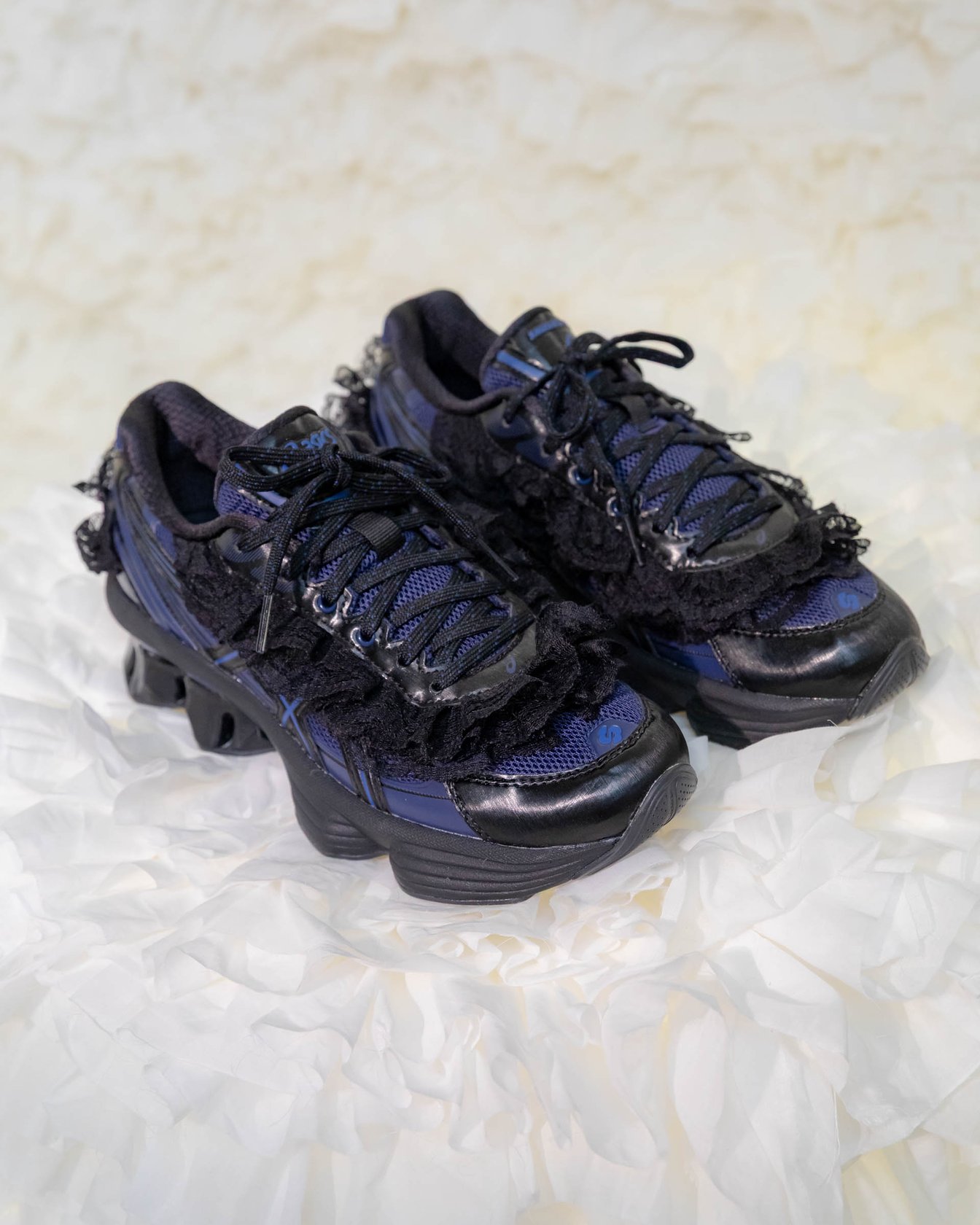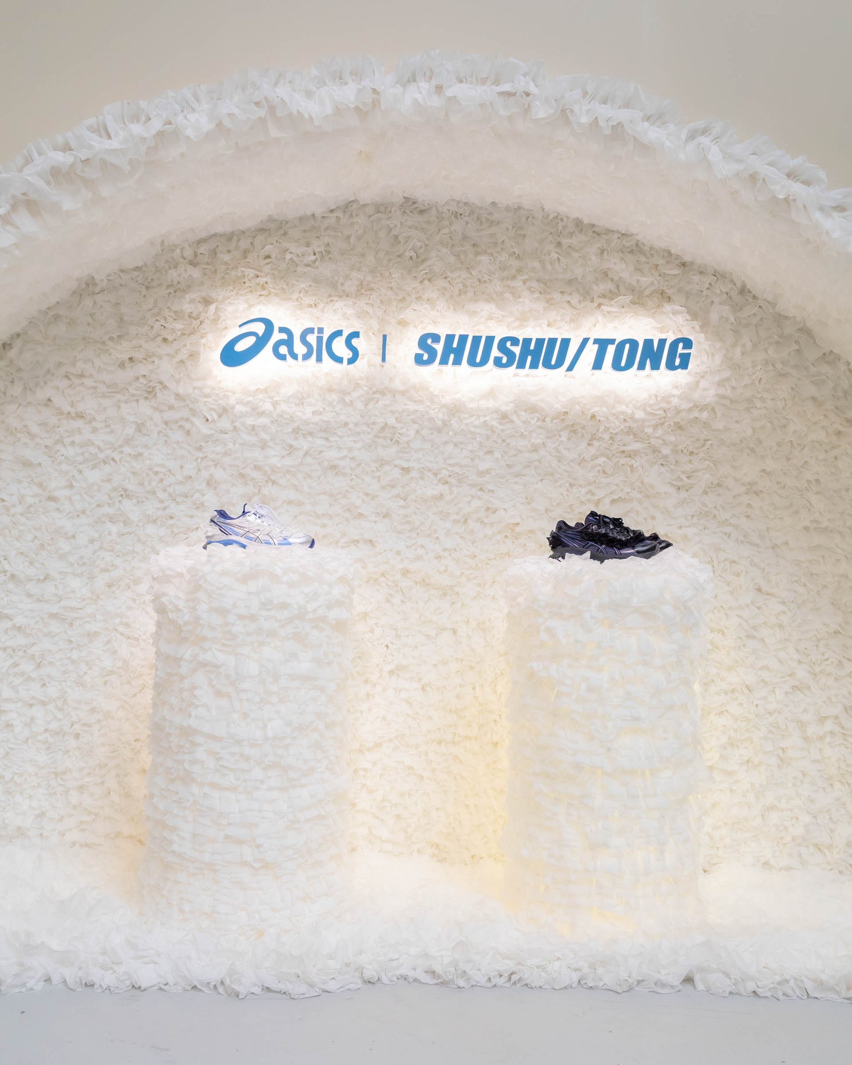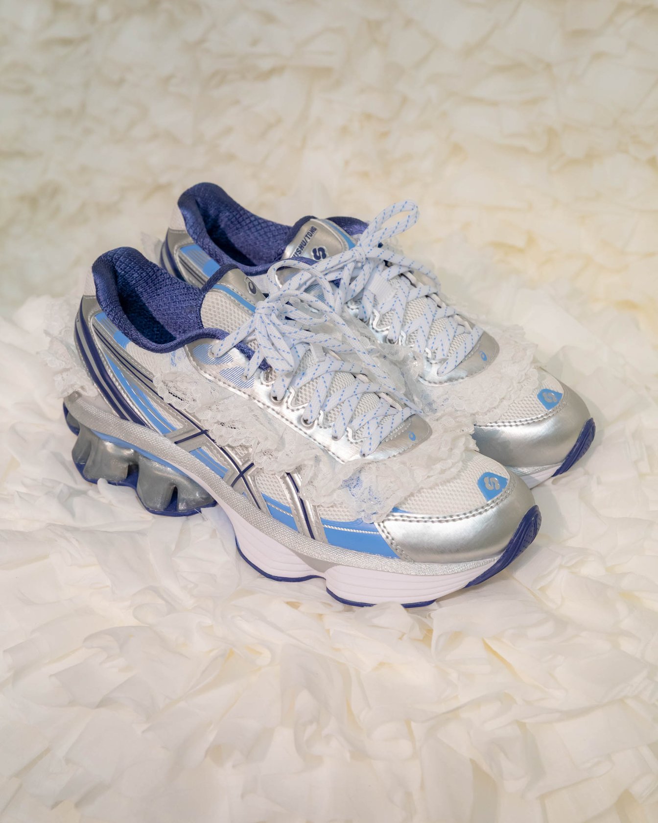 シュシュ/トングとのコラボモデルは、クラシックなランニングシューズから着想。レトロスタイルを現代のテクノロジーで再解釈した「GEL-KINETIC FLUENT」をベースに、アッパーにクラシックバレエからインスピレーションを得たレースのフリルをあしらった。ホワイトとブラックの2色をラインナップする。