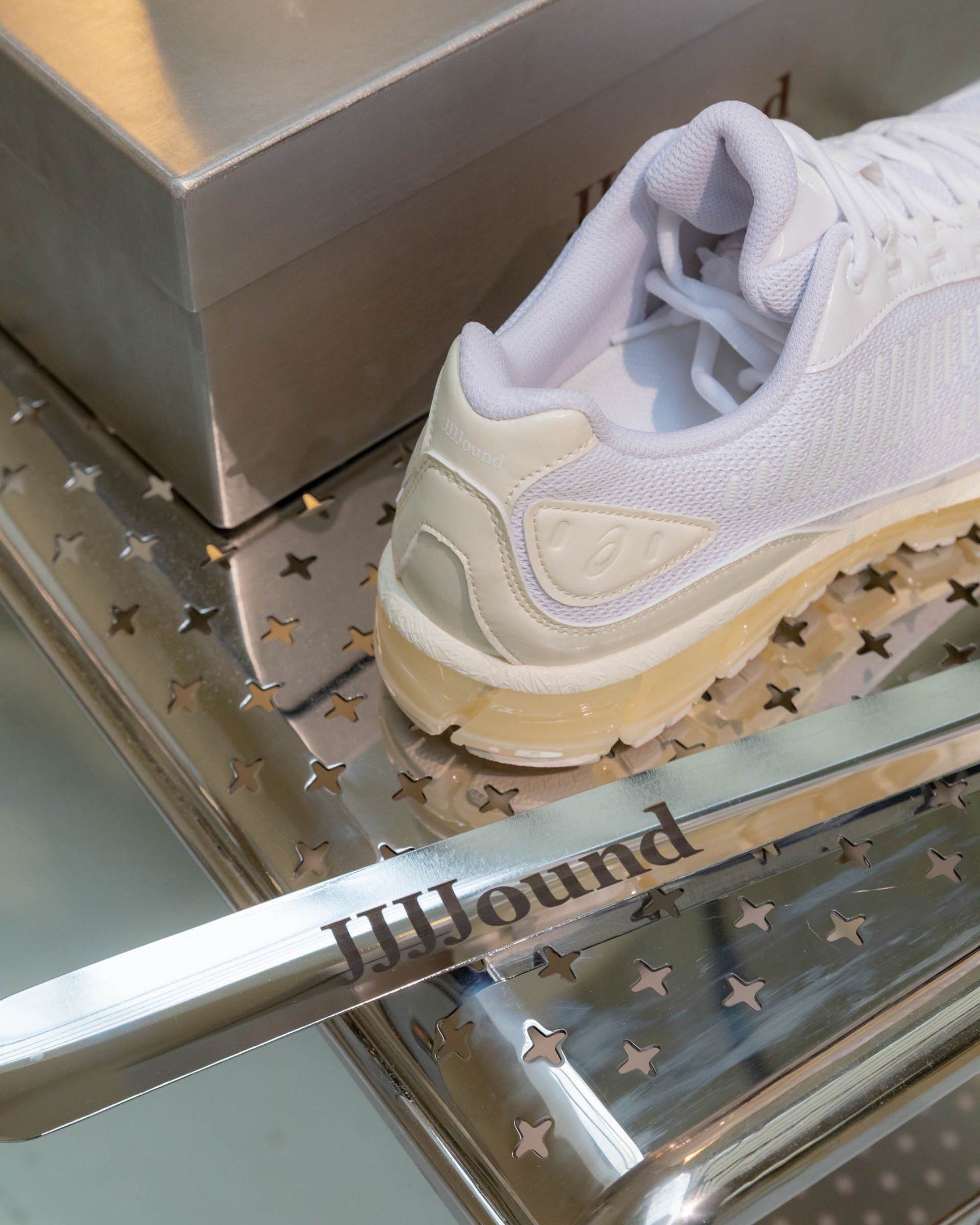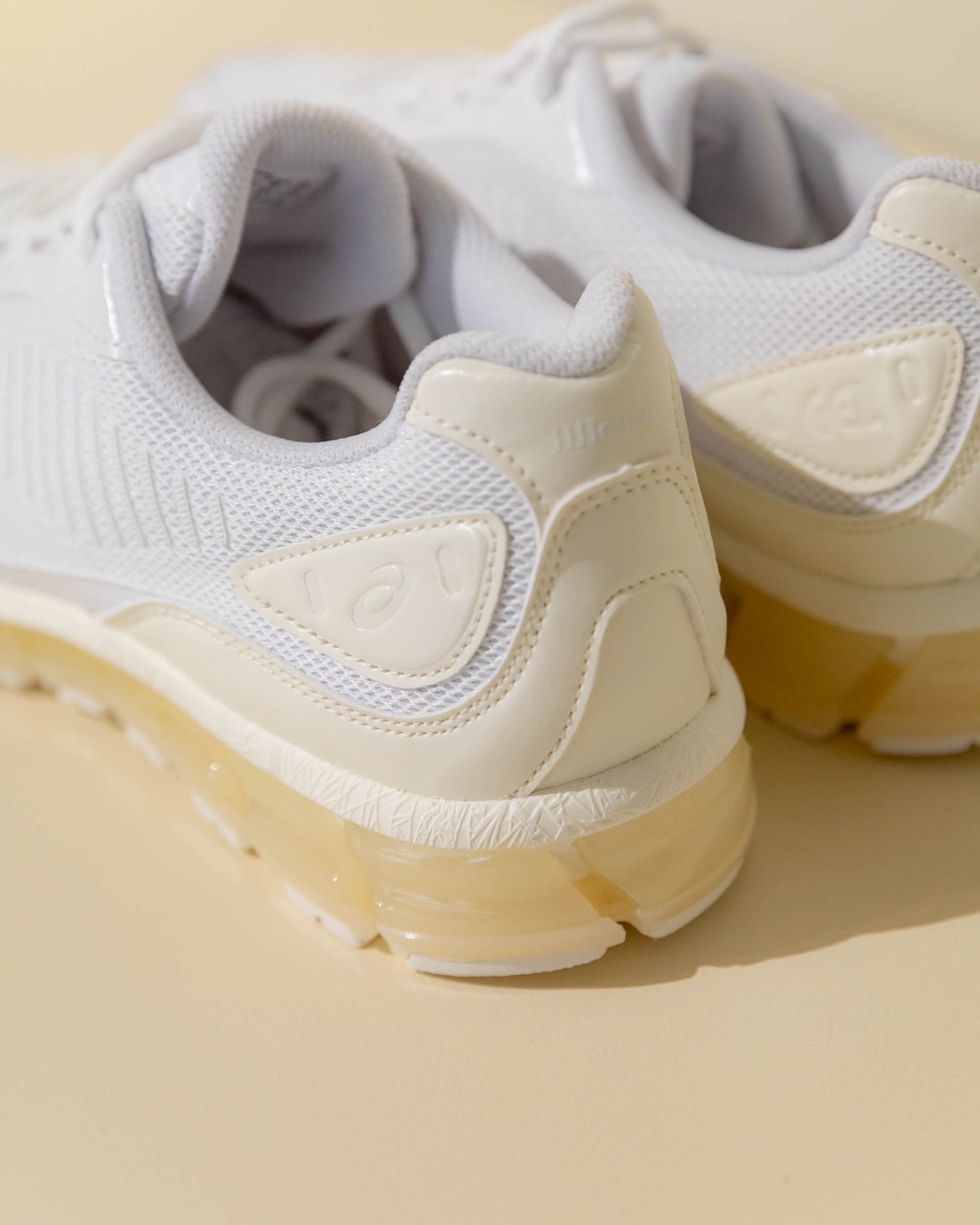 ジョウンドとのコラボモデルでは、「GEL-QUANTUM」シリーズ発売10周年を記念して製作した「GEL-QUANTUM 360 1 AMP」をオールホワイトカラーでアップデート。ソールにはクリアなアイボリーカラーを採用した。GEL-QUANTUMシリーズのファーストモデルは、アシックスが初めてミッドソール全体に衝撃緩衝性を高めたGELテクノロジーを採用したシューズでもある。