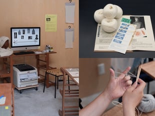 今回の展示では、「ニッツ?アンド?レビュー」 プロジェクトの実験的な取り組みの一環として、戦時下のアメリカ?イギリス?カナダで市民がホームフロント(戦地の兵士や負傷者への慰問)として編んでいたニットパターン8型を選定。現行の糸と道具で編める形に作り変えた編み図を、会場に設置されたPCとコピー機を用いて自由にプリントし持ち帰ることができる。