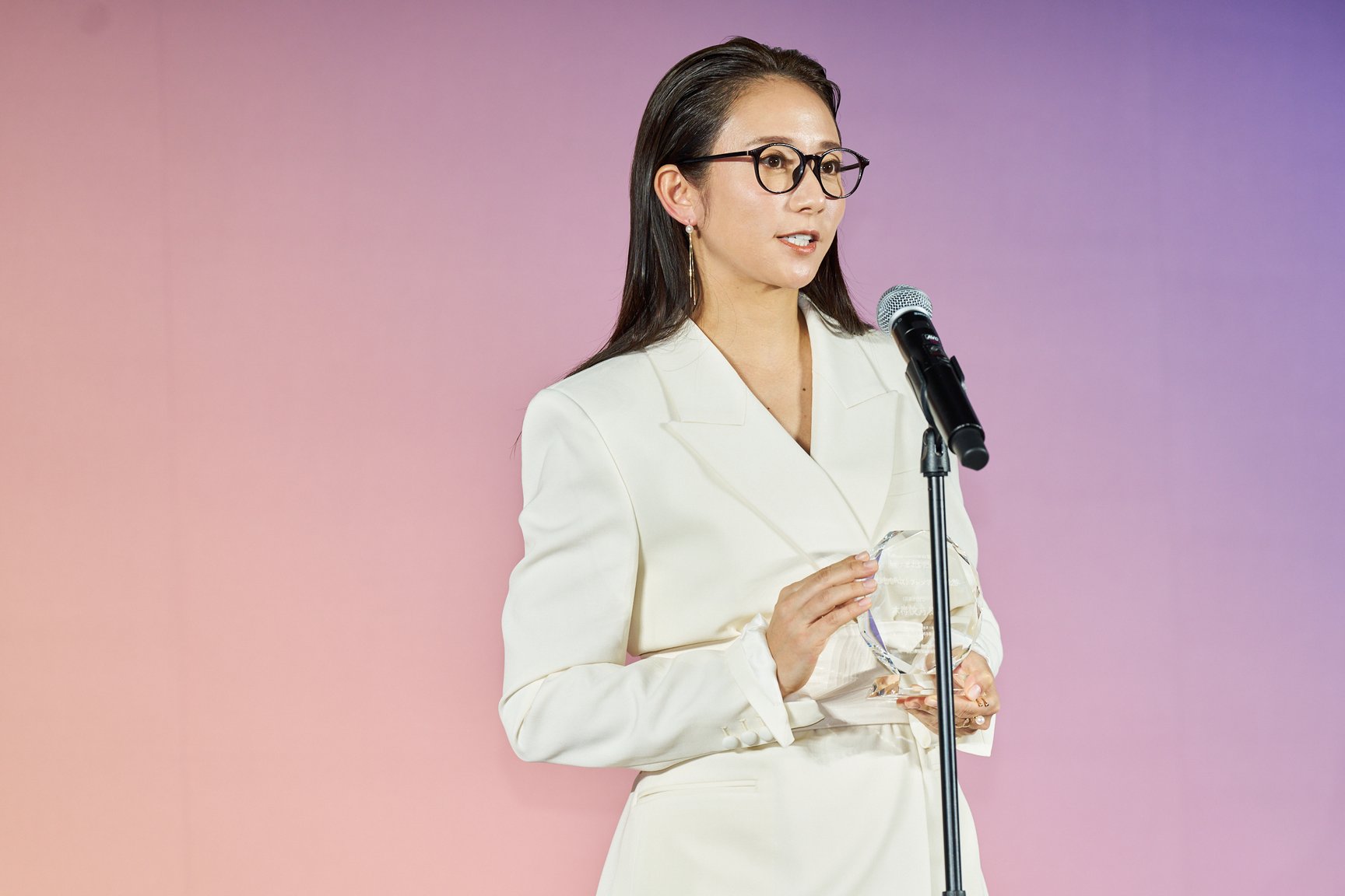 芸能界部門に選出された木村文乃は、ホワイトのジャケットとフレアスカートのセットアップに、銀縁のボストンフレームのメガネを着用し登壇。中学1年生からメガネを着用しているという木村は、「私の人生にとってメガネは相棒のような存在です」と話し、「メガネにまつわる賞をいただけて光栄に思います。これからもメガネと共に暮らしていきます」と締め括った。