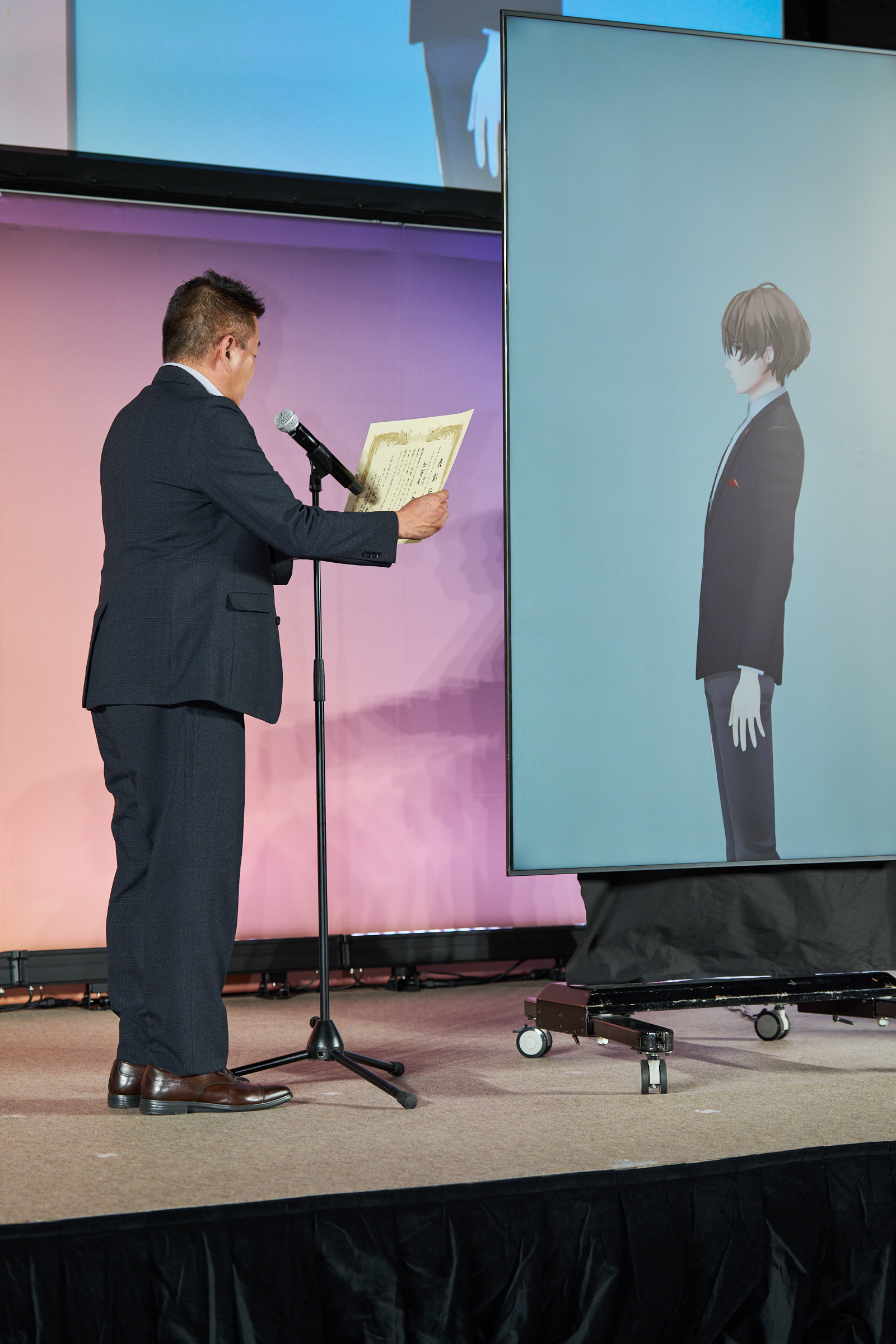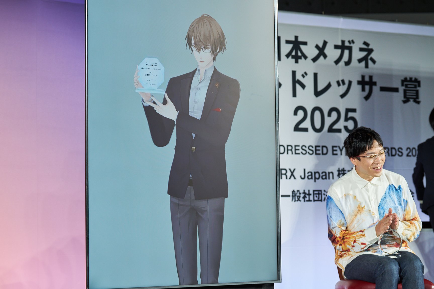 新設されたVTuber部門にノミネートされた加賀美ハヤトはモニターを通して出演。「30年以上の歴史を持つこの賞に次元の違う私が受賞してしまったことを深くお詫びいたします」と会場の笑いを誘い、「今後もバーチャルの世界からメガネ業界を盛り上げていきたいです」と意気込みを語った。
