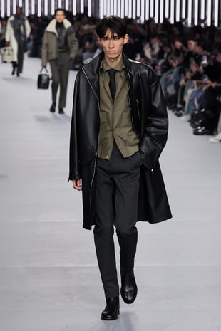 2026年秋冬メンズコレクションは、革新の中を歩み、探究し進化し続けるというエルメスの男性像を体現。メゾンが培ってきたヘリテージとともに、見えない部分や細部へのこだわりを随所に散りばめた。ラムスキンを編み込んだカシミヤニットや、ステッチでストライプを表現したカーフスキンのセットアップ、そしてシアリングを裏打ちしたテクニカル素材など、高度な技術を用いながら実用性を融合。全58ルックのうち、1991年秋冬コレクションのジャンプスーツなど、9型のアーカイヴデザインが現代の解釈で再登場した。ヴェロニクの集大成とも言えるが決して懐古的ではなく、「今と永遠のための服」というタイムレスなメンズコレクションとなった。