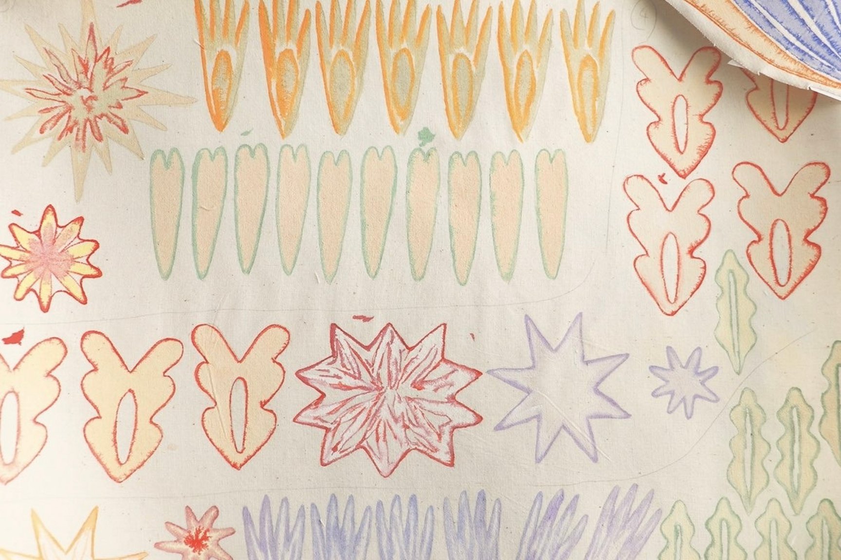 Mona Sugataは、200年以上にわたりフランスで受け継がれてきたクチュールのコテ技法を参照し、熱したコテで布を成形しながら立体作品を制作するアーティスト。染料の滲みや皺の出方といった布の不確定な反応を「素材との対話」として受け入れることで生まれる造形は、光や空気、時間によって表情を変える“状態”として存在する。