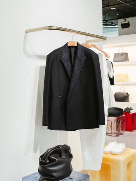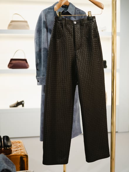 2026年サマーコレクションは、レディ?トゥ?ウェアでもイントレチャートをメゾンの核として踏襲し、さまざまなサイズ、シルエット、素材でアレンジ。ジャケットではイタリアのサルトリアルなコードを礎としながら、アイコンバッグ「カバ」に着想を得て、ストラクチャーのあるフォルムに軽やかさを取り入れた。