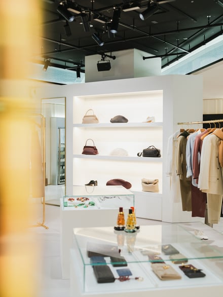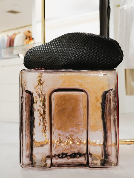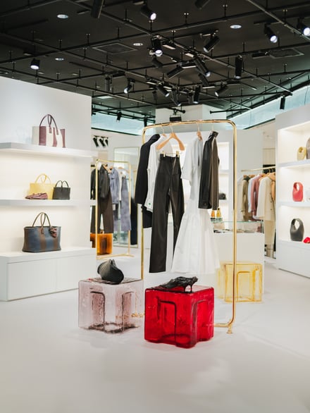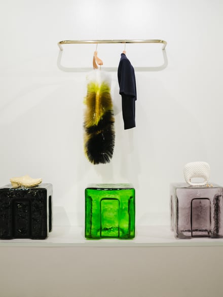 ポップアップ会場は、コレクションの世界観を反映したモダンでクリーンな空間を演出。ショー会場で実際に使用したムラーノガラスの色鮮やかなキューブを設置した。