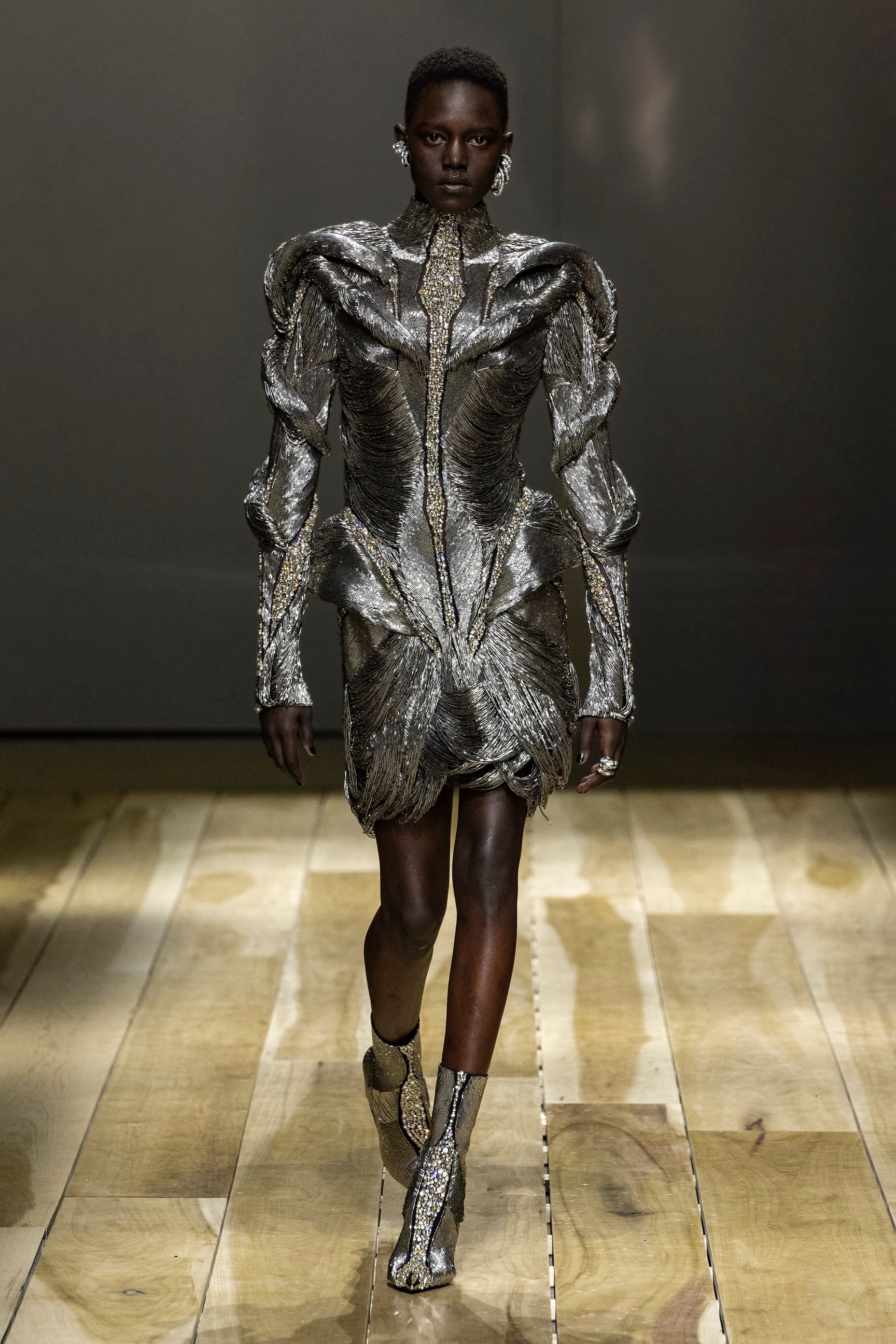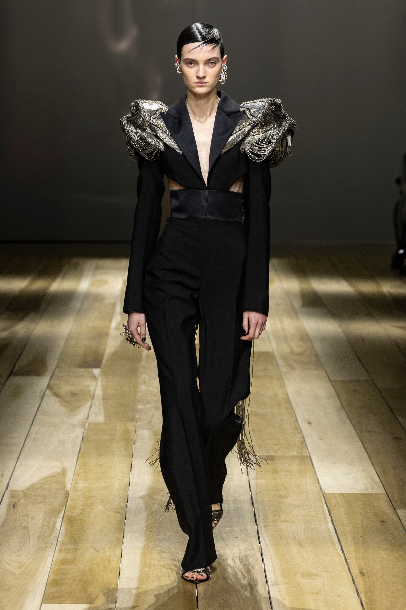 マックイーンといえばサヴィル?ロウ仕込みの卓越したテーラリング、そしてダークな要素を併せ持ったファンタジーの要素は欠かせない。バートンはそういったブランドの強みに立ち返り、それが今も健在であることを示した。