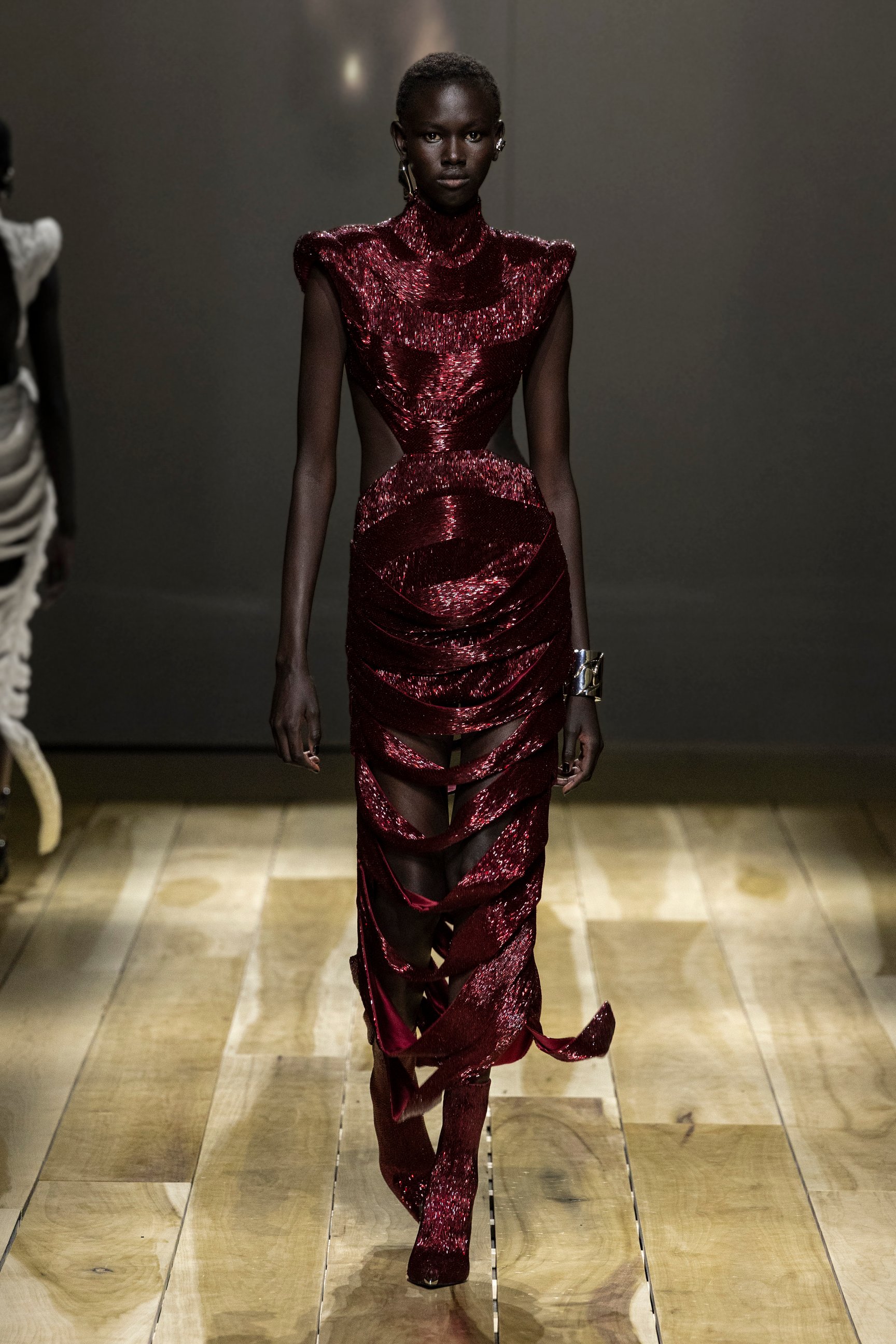 バートンは今回、レオナルド?ダ?ヴィンチ(Leonardo da Vinci)の解剖図にインスパイアされ、生地を切り裂いたり、ねじったり、裏返したりと、服そのもののアナトミーを試みた。また、ハッとするようなルビーレッドのドレスは、血や内臓、筋肉に意識を向けさせる。“アナトミードレス”と名付けられたルックはいずれも生々しく、力強い美しさを放っていた。バートンは「ファッションの基本は、身体に沿ったカットと、身体の内側からインスピレーションを得たものだと考えている」と説明する。