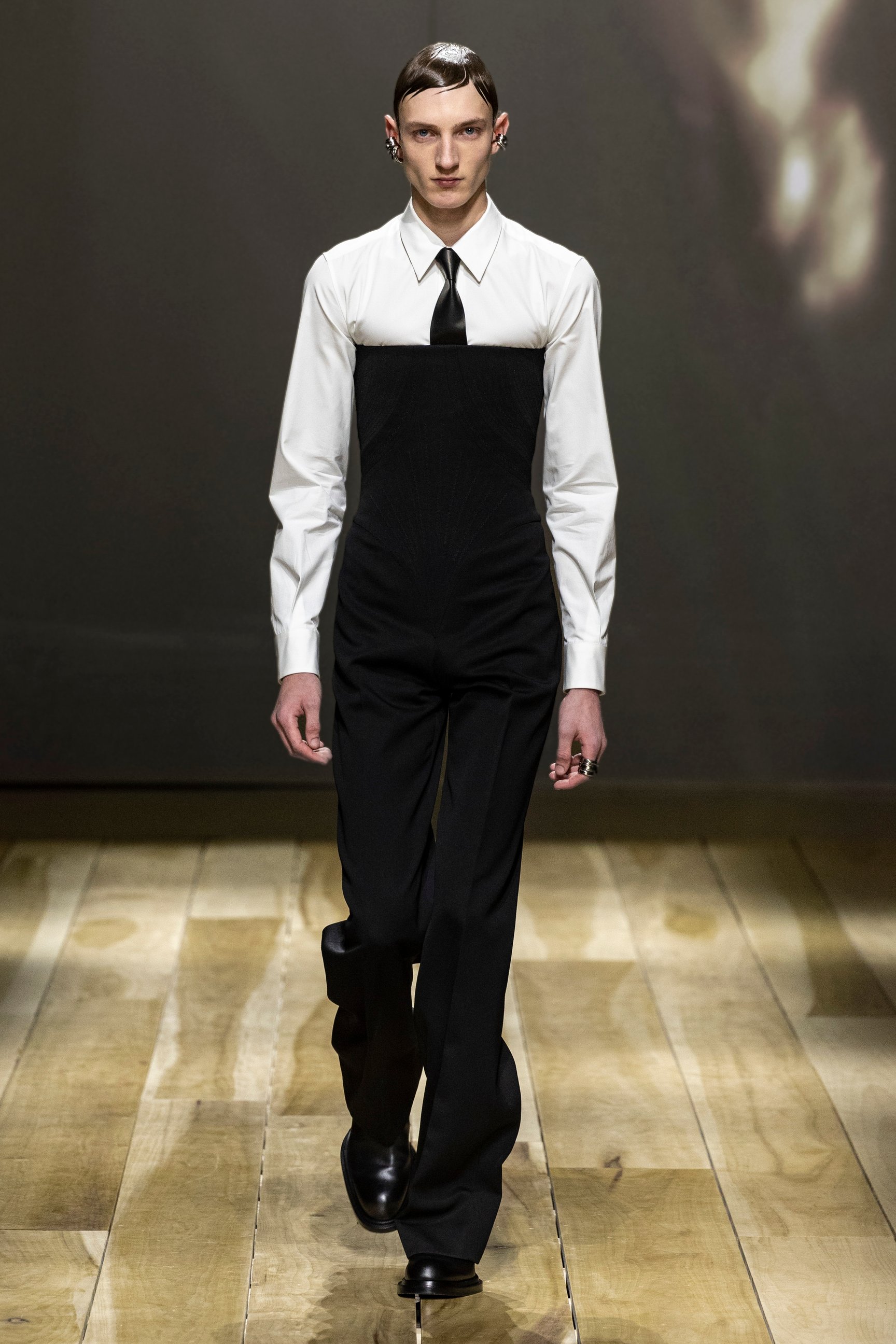 そして今回あらためて注目されたのが、巧みなテーラリング技術だ。シャープなライン使いやショルダーの存在感が光り、黒いネクタイとコルセットを合わせたアンドロジナスなスタイリングも際立つ。これらは映画「TAR/ター」でベルリン?フィル初の女性マエストロを演じたケイト?ブランシェット(Cate Blanchett)の姿から影響を受けたものだという。